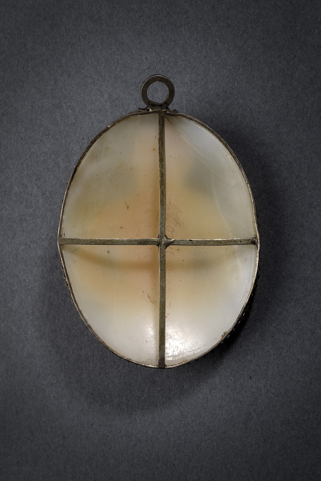 Pendant in onyx (?), carved in high relief, with a fine portrait of Victor Emmanuel II in uniform, with sabre and order insignia. Metal frame.