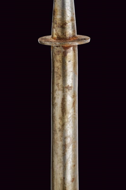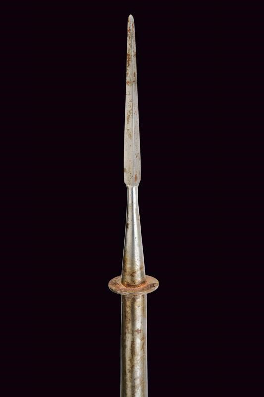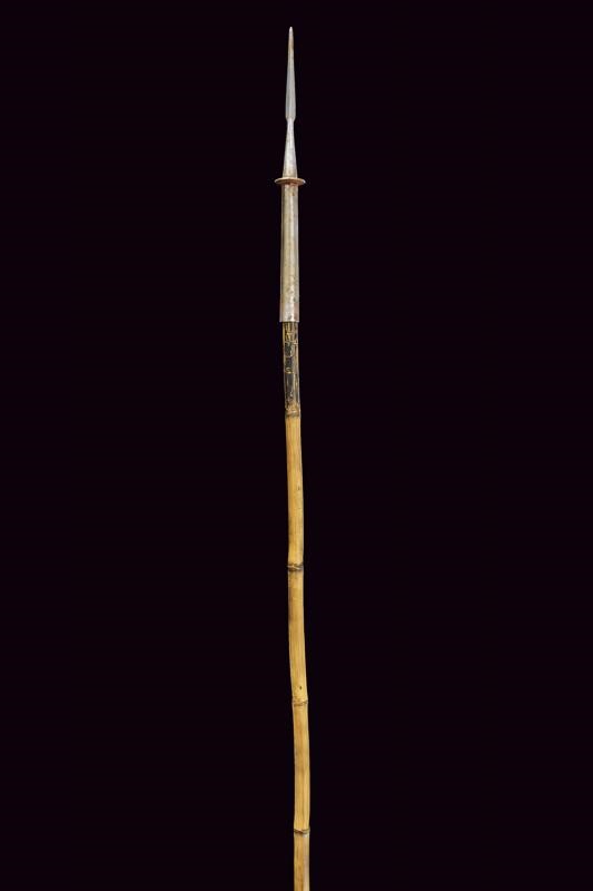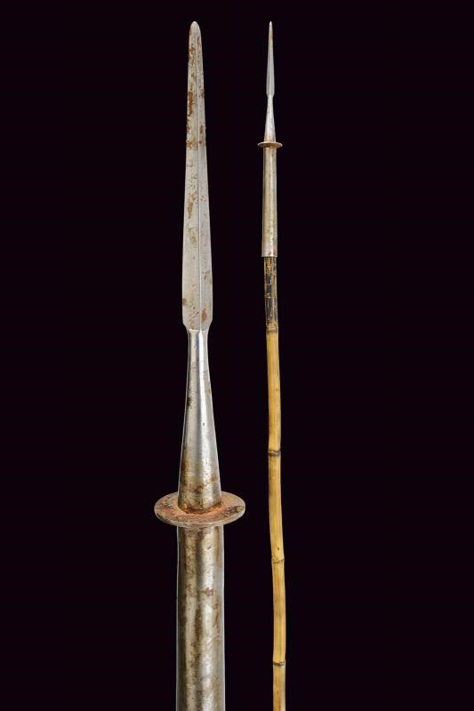 Small square-headed cusp on a shaft shaped as a truncated cone, with a disc at the base. Modification of the 1860 lances for colonial use, with the straps replaced by a long tubular iron socket. Typical bamboo shaft (pertinent?). Traces of use and age.