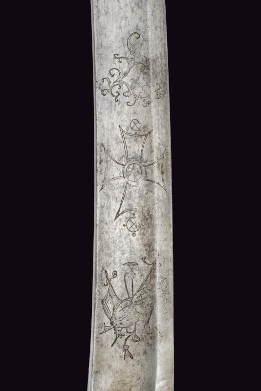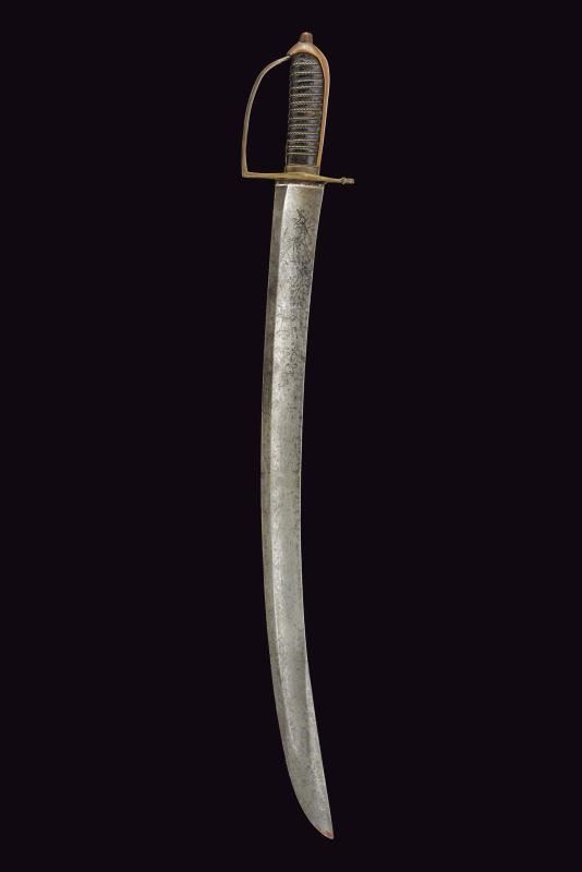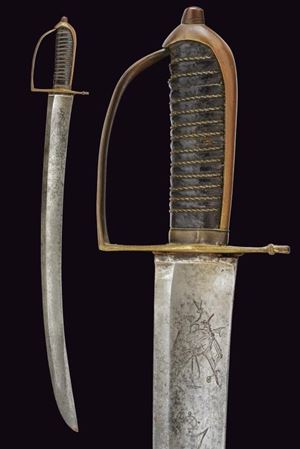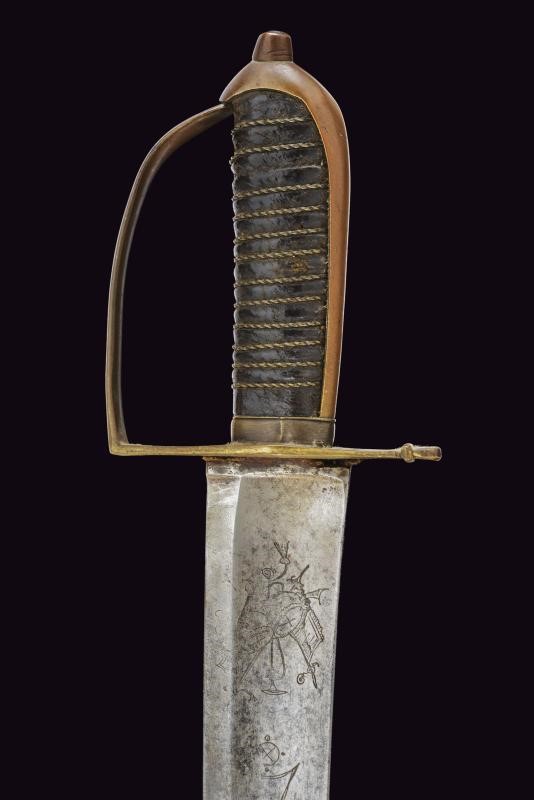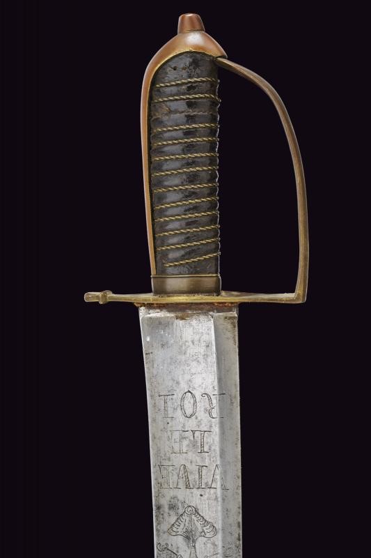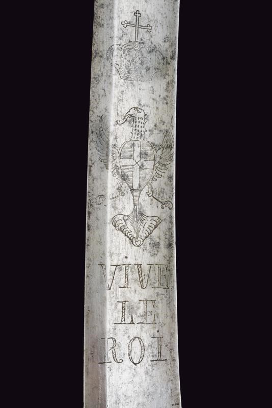 Large, curved blade with fuller along almost its entire length, featuring on the right side the “Hanseatic cross” of the Alemannic troops surmounting a trophy of drums and flags, on the opposite side marked with the Savoy eagle surmounted by a crown and above the motto “VIVE LE ROI.” One-quillon brass hilt with stirrup guard. Long smooth cap. Handle covered in leather, probably antique, with metal wire binding. Some signs of wear and age, especially on the blade. Without scabbard. Uncommon.