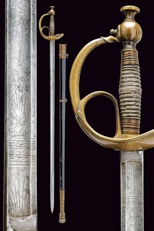 Well-preserved, single-and short-false-edged blade, with fuller, featuring clearly visible trophy and floral engravings on the first half; signed “Wester & Co. / Solingen” in cursive. Back engraved with leaves. Brass hilt with typical two-piece rain-guard and guard with ring. Handle with brass ring-nuts and silver-colored foil covering. Black-painted iron scabbard with brass mounts featuring two lugs. Small signs of wear and age.