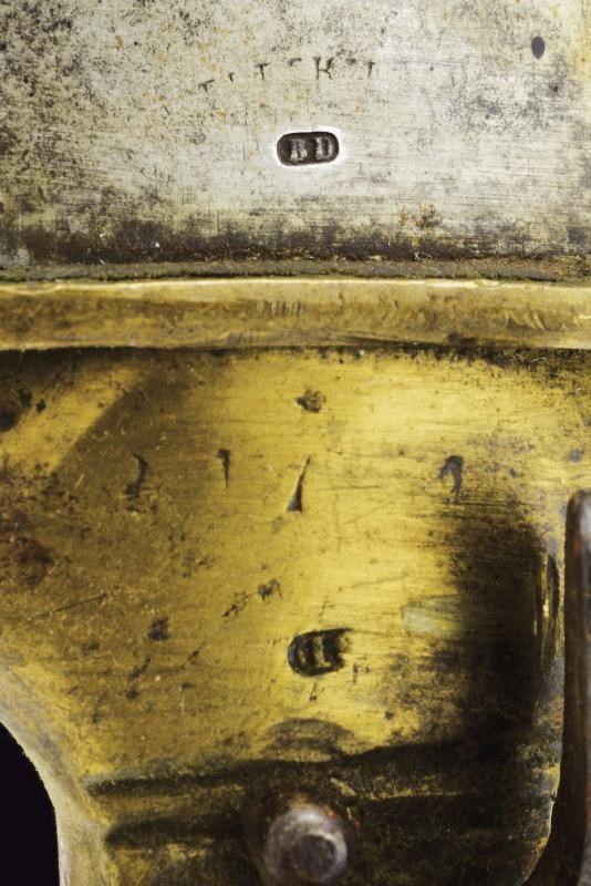 Tang marked "BD"; brass grip marked “21031” and "D" with iron spring. Leather scabbard with brass mounts.