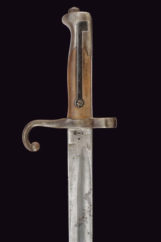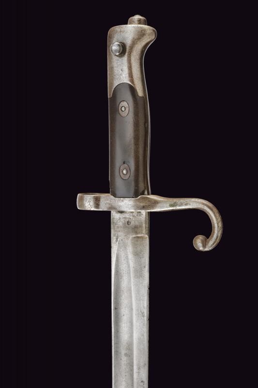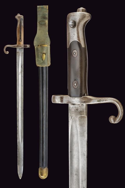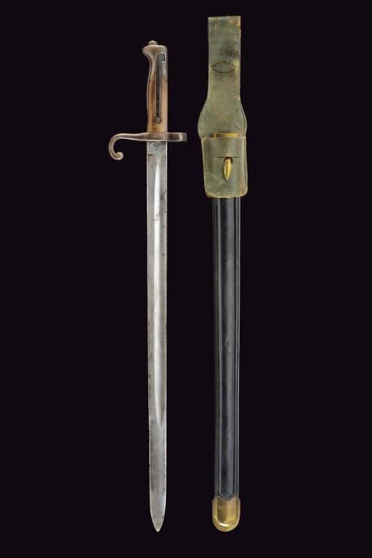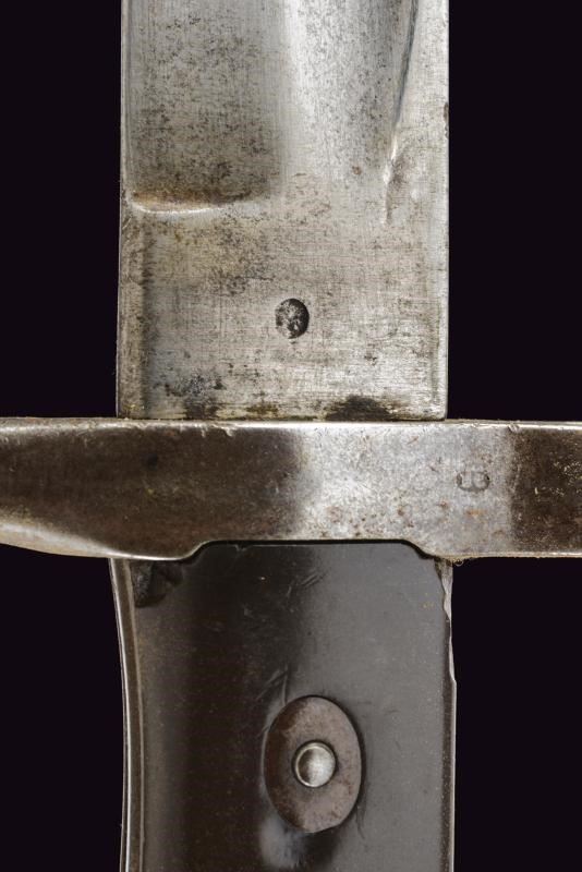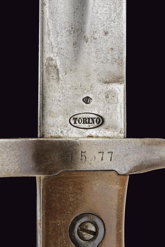 Straight, fullered blade; ricasso marked “TORINO” and with two stamps (one on each side). Iron crossguard, numbered and with a ring. Iron muzzle cap; long spring and a working release button. Leather scabbard with brass mounts, and a small leather pouch.