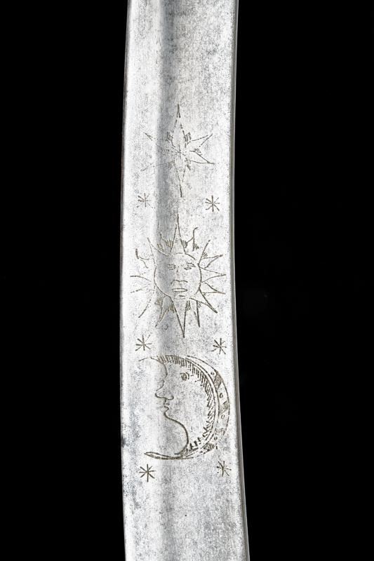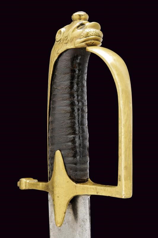 Wide, curved, single-and short false-edged blade, with wide fuller and thin tang; base marked “FRINGIA,” the other side engraved with sun, moon, and stars. Brass hilt with langets, flat loop-guard, and lion-head pommel with long cap. Wooden grip covered in leather. Leather scabbard with brass mounts and heart-shaped button. Complete with white leather shoulder strap.
