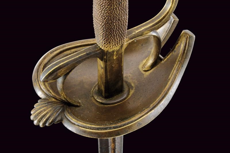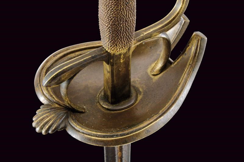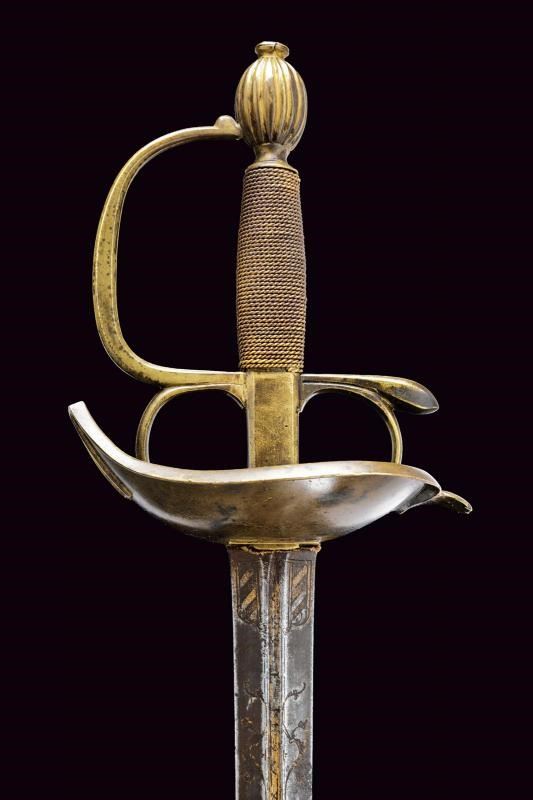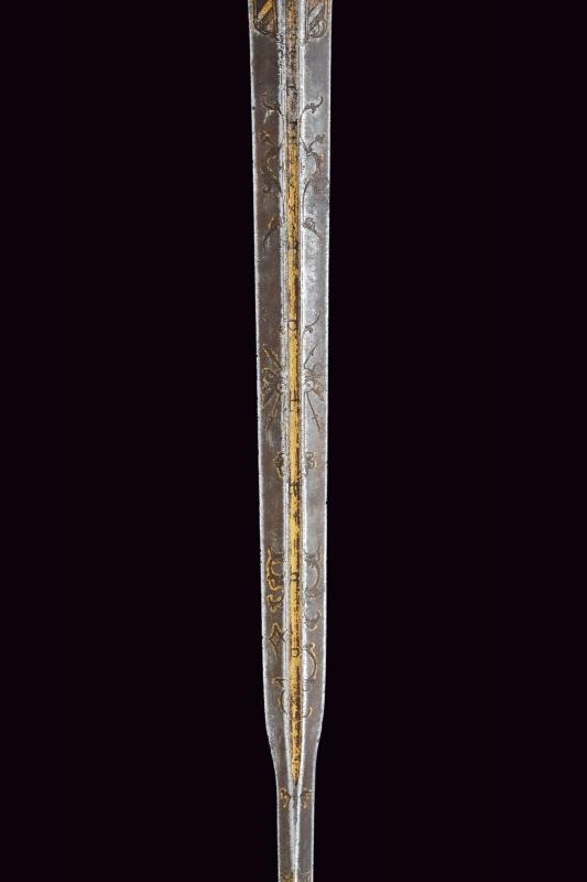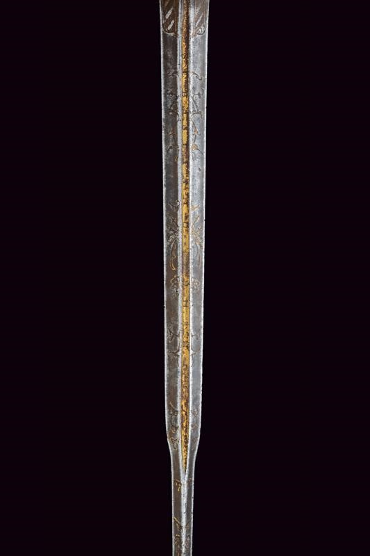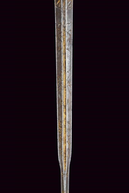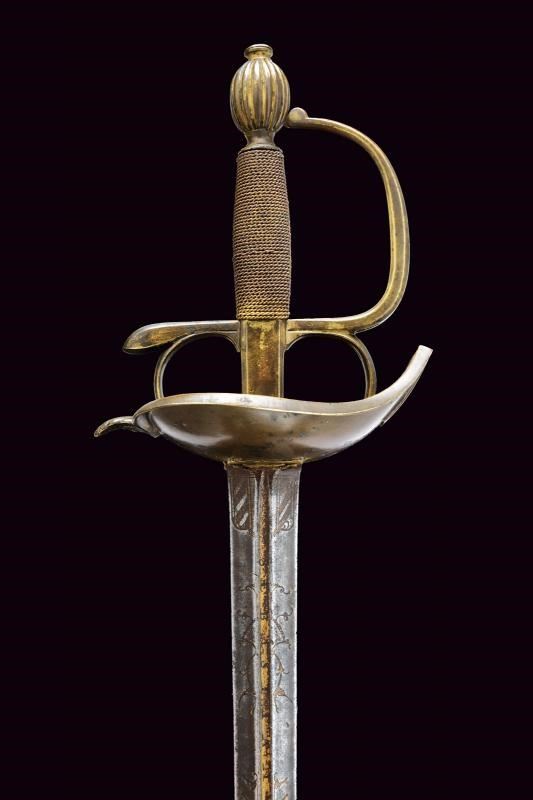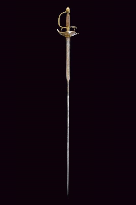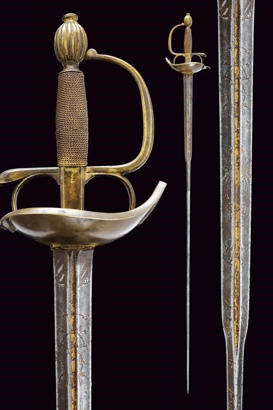 Beautiful colichemarde, wide, double-edged blade, with central groove, engraved with trophies and floral motifs with traces of gilding, inscription “SEBASTIANO......” (not entirely legible) on one side and “EN TOLEDO” on the other. Bronze hilt with traces of gilding, heart-shaped rain guard, loop-guard, oval pommel with longitudinal grooves. Wooden grip covered with brass wire binding.