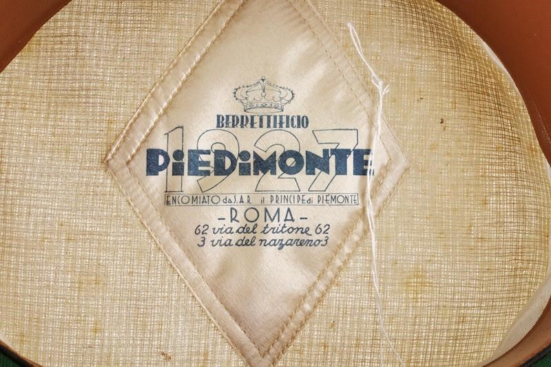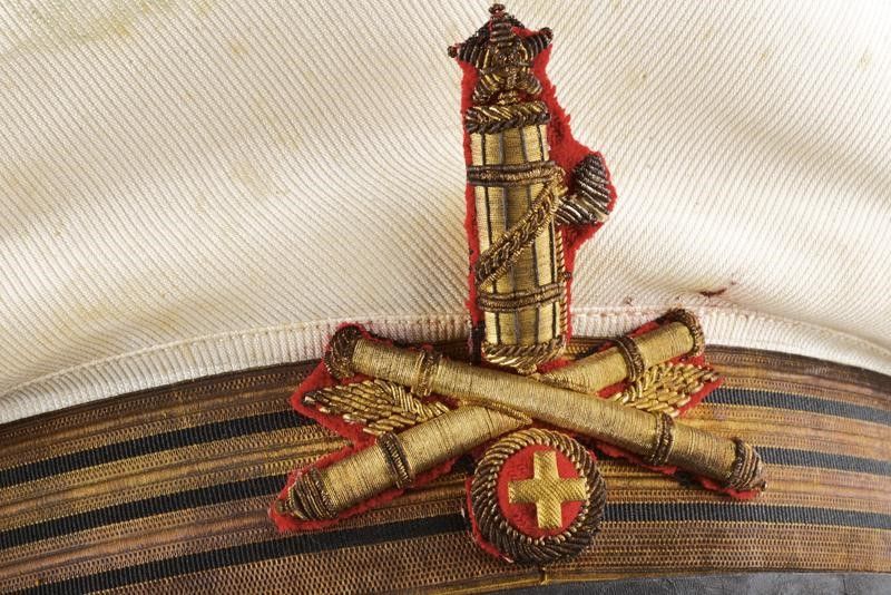 dating: Second quarter of the 20th Century provenance: Italy, Made of white cloth (apparently free of woodworm holes but with some stains). Black band with colonel stripes. Front gilded-threads decoration with red lining and with metallic cross. Visor in good condition with pieces of paper attached (easily removable). Buttons with the Savoy eagle on fasces. Well-preserved sweat-band inside with mesh lining featuring the label of the Piedimonte company of Rome. height circa 14 cm.