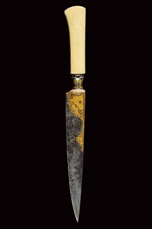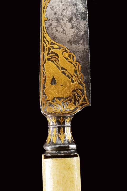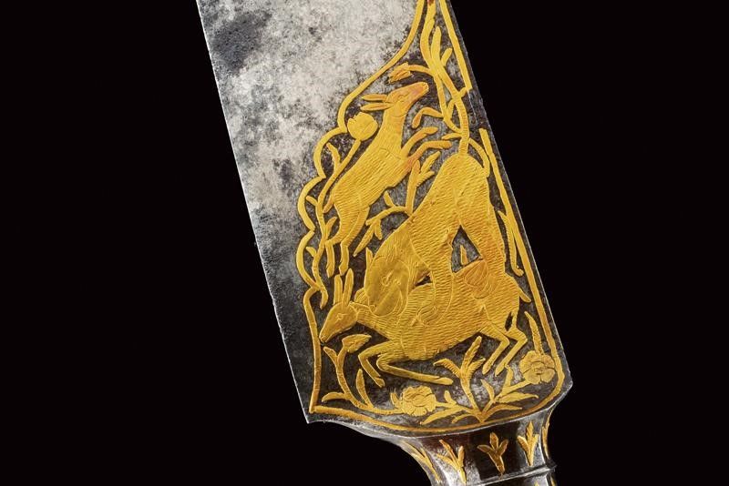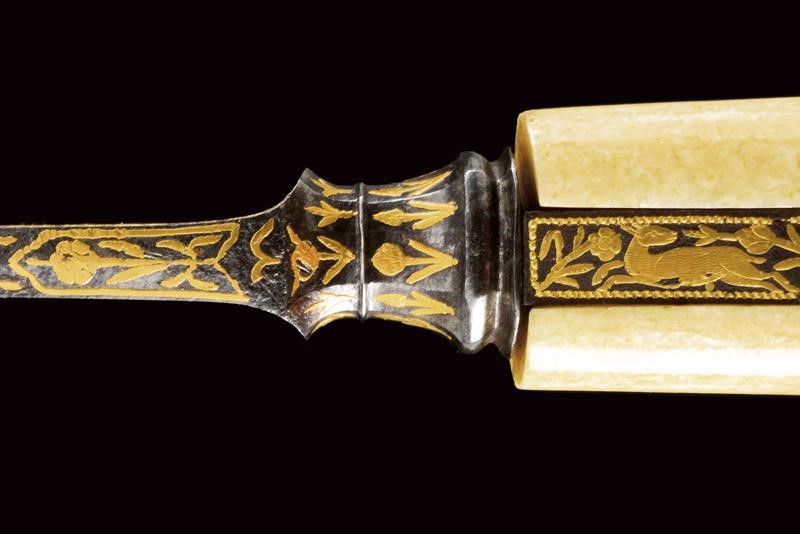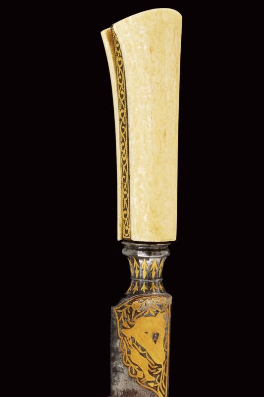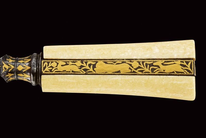 dating: Mid 19th Century provenance: Persia, Solid, single-edged, triangular blade, the base with very fine gold decorations depicting a hunting scene with a lion and two roe deer, higher up a bird, all among floral motifs, on both sides, the back ribbed. Capital knot, faceted and decorated with flowers in gold. Grip with beautiful walrus-tusk grips, with iron band at the center; the rear part and the pommel decorated with a similar hunting scene, the lower part with garlands with beaded edge. length 36.5 cm.