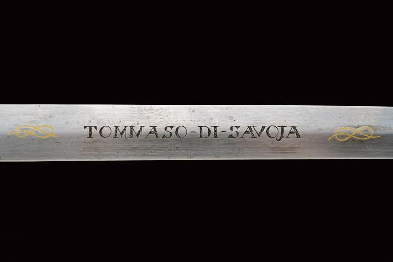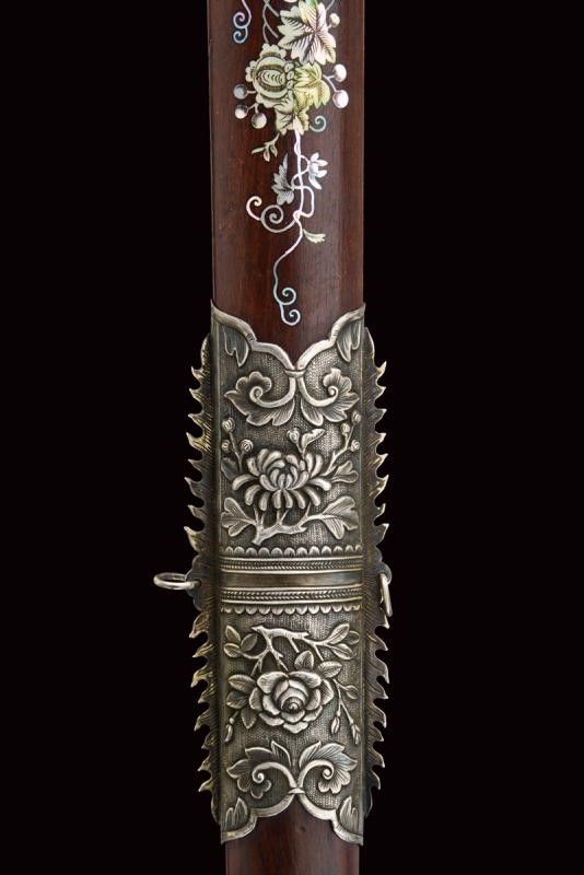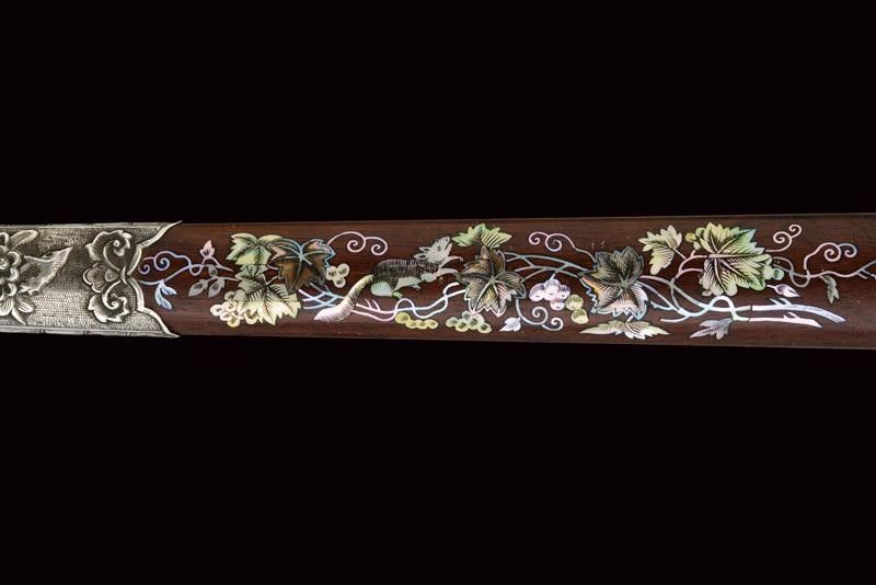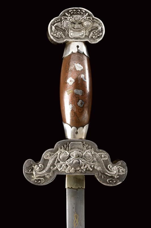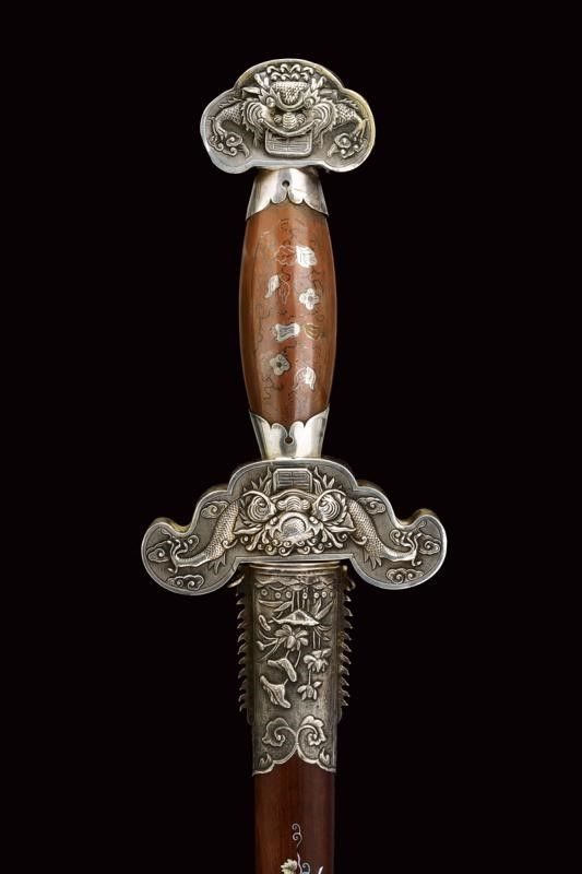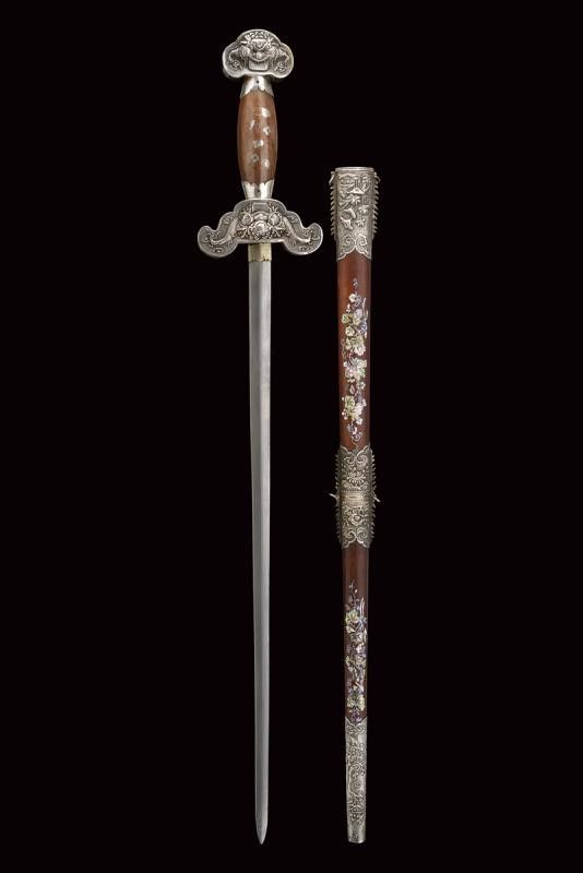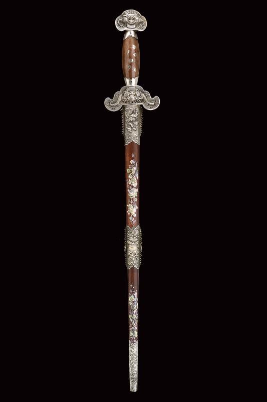 dating: about 1880 provenance: Vietnam, Straight, double-edged blade, ribbed in the middle, tang covered with a brass-colored, metal ring-nut, with the inscription 'TOMMASO DI SAVOJA' on one side, between Savoy knots (the inscription probably added in modern times). Bronze-foil, oval grip with fine silver floral inlays. Embossed and engraved silver quillon and pommel decorated with dragons and ideograms. Wooden scabbard with very fine, floral, mother-of-pearl inlays, and with silver mounts embossed and engraved with floral motifs on a granulated background, four suspension rings. length 92 cm.