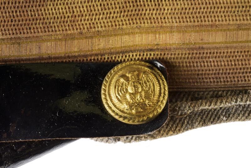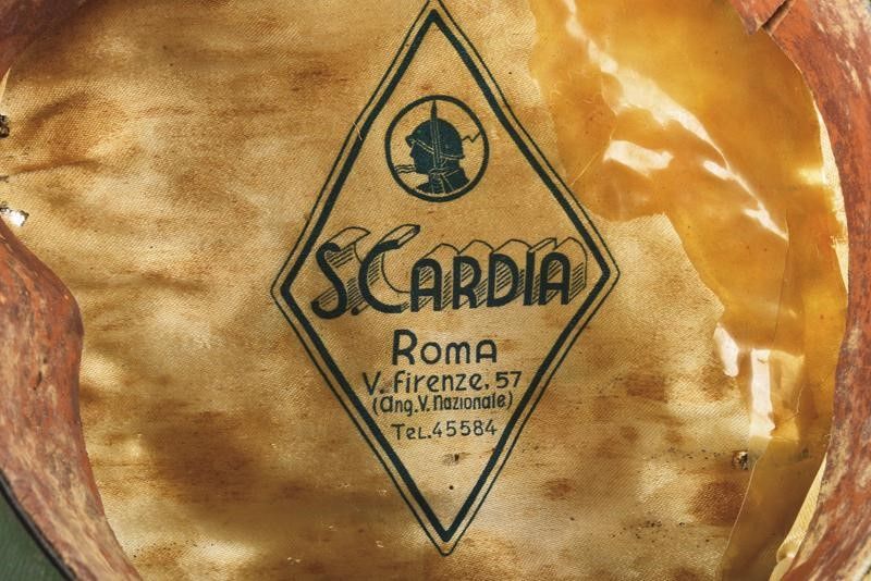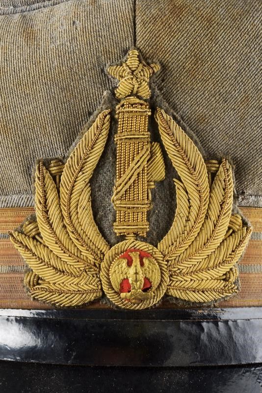 dating: Second quarter of the 20th Century provenance: Italy, Made of gray-green cloth (stains and various wormholes), with gray-green band and first-senior stripes, front gilded-threads decoration with metal Savoy eagle on red cloth. Buttons with eagle in relief. Sweat-band with signs of use, lining with S. Cardia of Rome marking (stains). Visor and chin-strap well preserved. Signs of use and time. height circa 16 cm.