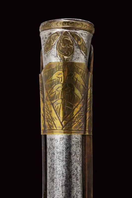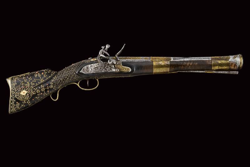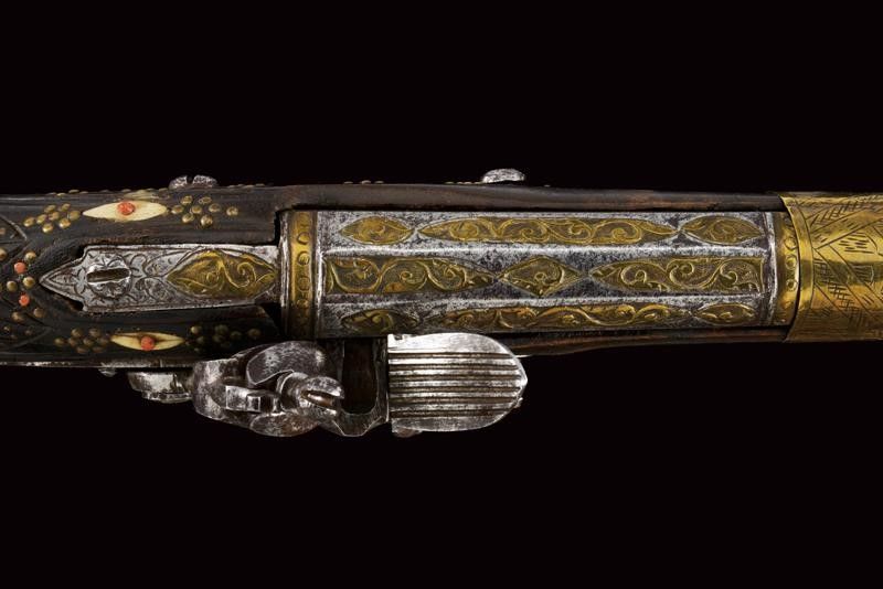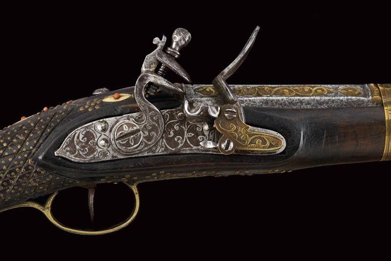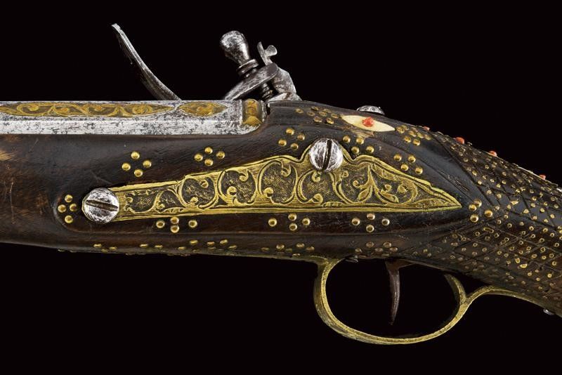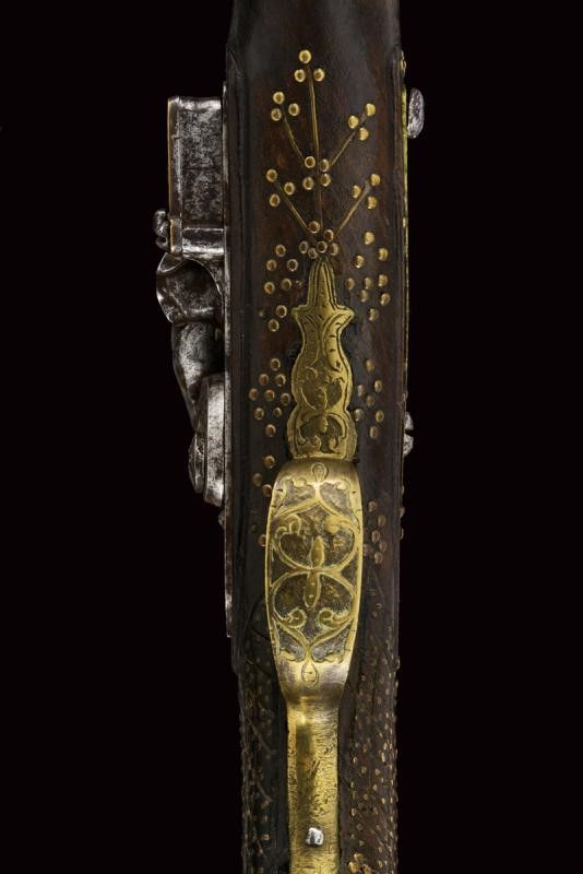 dating: First half of the 19th Century provenance: Balkans, Smoothbore, two-stage barre, octagonal at the first part with frame and brass inlays, then, after a brass ring, round with enlarged nozzle and decorated en suite with the tang. Flintlock carved with floral motifs, the plate above the spring with brass engravings. Full wooden stock, the butt and base fully decorated with brass and bone inlays, and decorated with small corals. Brass mounts decorated en suite, smooth butt plate. Two engraved, brass-foil brackets. Iron ramrod. Working mechanism. length 55 cm.