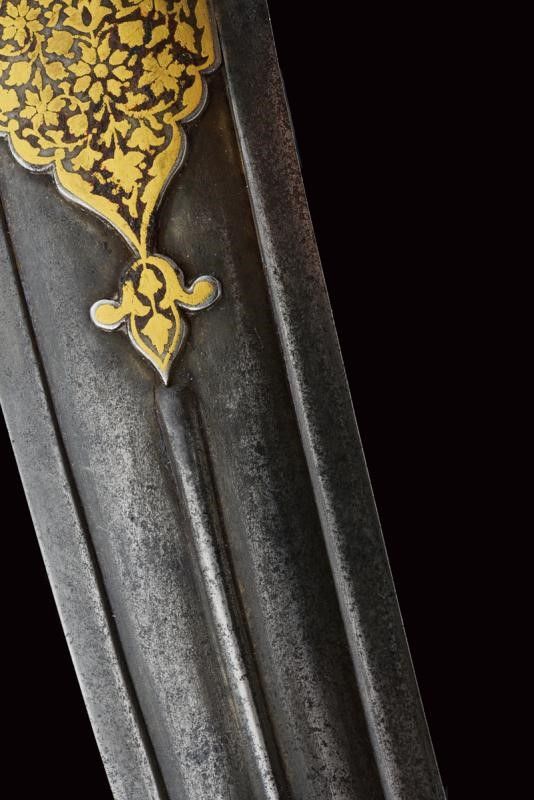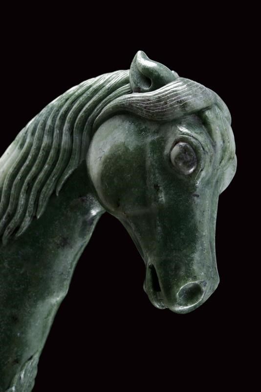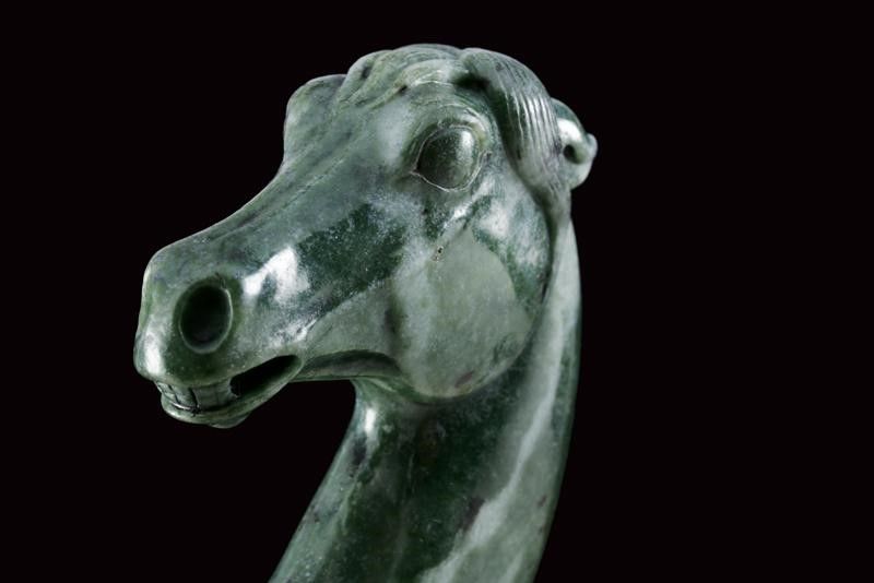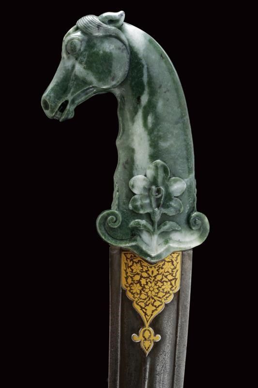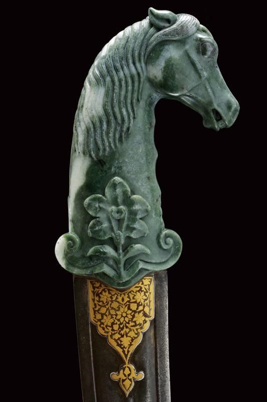 dating: First half of the 19th Century provenance: North India, Double-edged blade with two large fullers divided at the center by a cannelure, probably made of damask; raised, gold-inlaid base with floral motifs. Serpentine (ophite) hilt sculpted with a horse's head, a long horsehair at the back and a high-relieved flower at the base. See a similar hilt in 'Islamic and Oriental Arms and Armour' by Robert Hales, page 32 nr. 75 length 42.7 cm.