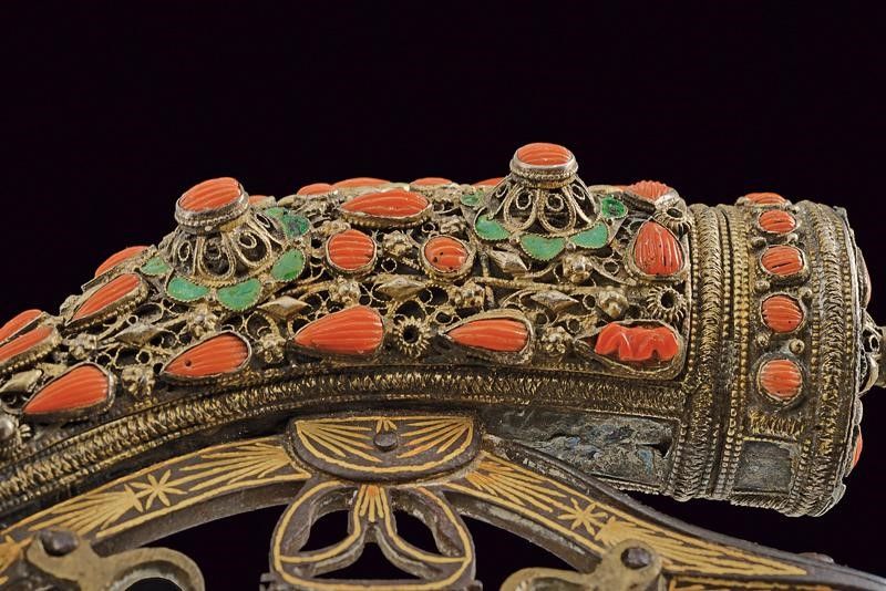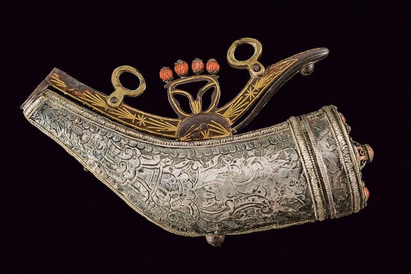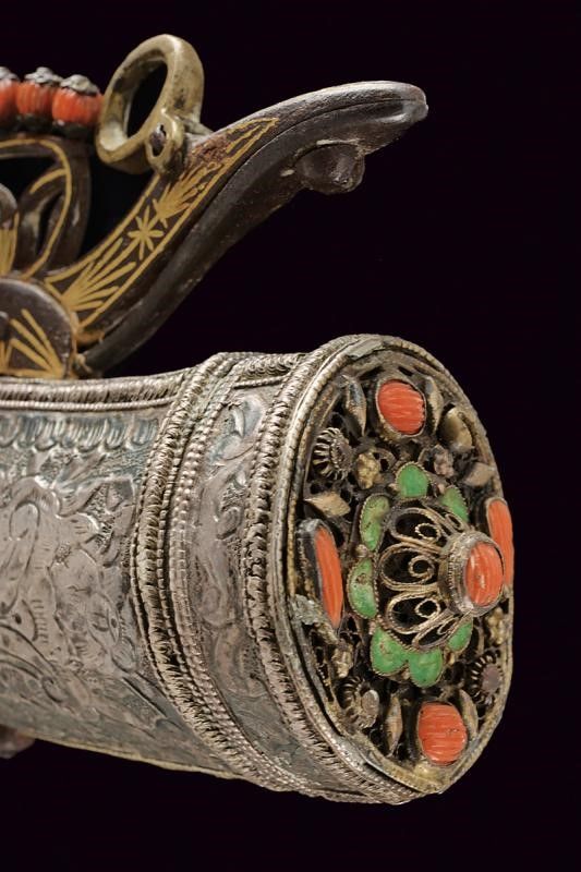 dating: Late 18th - Early 19th Century provenance: Turkey, Body of elliptical section with typically curved shape tapering toward the fuse, completely covered with silver foil. Finely worked with filigree frames, spirals and buds at the front side enriched with several cabochon coral drops. In the center three rosettes with green-enameled petals and with a central coral cabochon held by filigree spirals. The lid on the wider side decorated en suite with corals and a large central rosette with enameled petals. The rear side also covered with silver foil, engraved with floral motifs. On the back, typical iron band closure system hinged in the center and with spring, this one embellished with gold inlays, provided in the center with a pierced ornament surmounted by coral buds and with two brass lugs on a hinged base. Some signs of time and chips to the enamels. High quality model with the typical manufacture of the city of Trebizond in Turkey. length 16 cm.
