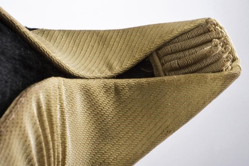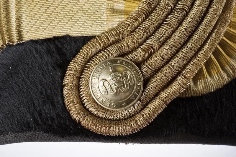 dating: Mid 20th Century provenance: State of the Vatican City, Made of black coypu with silvered noose and chevron, yellow and silver cockade, button with papal tiara and inscription 'Gendarmeria Pontificia,' inside leather sweat-band and maker's mark ' A. Gallo - Rome - Via in Lucina 7'. height 12 cm.