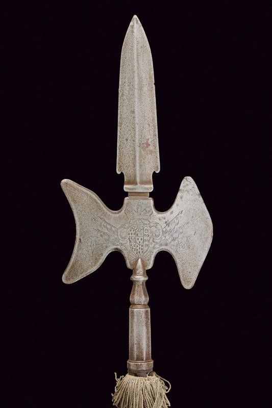 dating: Late 18th - Early 19th Century provenance: Naples, Spearhead with bladed cusp with central cannelure; the axes, one convex and one concave, finely engraved on both sides with the Bourbon coat of arms surmounted by a crown and on flags; faceted ferrule with straps numbered '98' and marked 'S'; faceted wooden shaft with iron foot and tassel. Very rare. Ferdinand IV era (1759-1799, 1799-1806 and 1815-1816). height 208 cm.