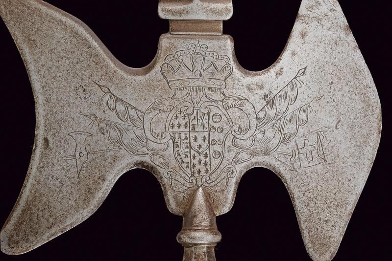 dating: Late 18th - Early 19th Century provenance: Naples, Spearhead with bladed cusp with central cannelure; the axes, one convex and one concave, finely engraved on both sides with the Bourbon coat of arms surmounted by a crown and on flags; faceted ferrule with straps numbered '98' and marked 'S'; faceted wooden shaft with iron foot and tassel. Very rare. Ferdinand IV era (1759-1799, 1799-1806 and 1815-1816). height 208 cm.