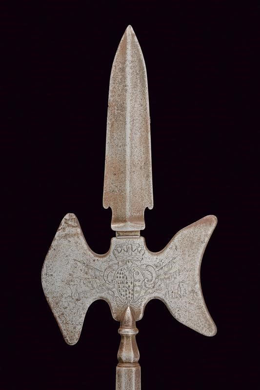 dating: Late 18th - Early 19th Century provenance: Naples, Spearhead with bladed cusp with central cannelure; the axes, one convex and one concave, finely engraved on both sides with the Bourbon coat of arms surmounted by a crown and on flags; faceted ferrule with straps numbered '98' and marked 'S'; faceted wooden shaft with iron foot and tassel. Very rare. Ferdinand IV era (1759-1799, 1799-1806 and 1815-1816). height 208 cm.