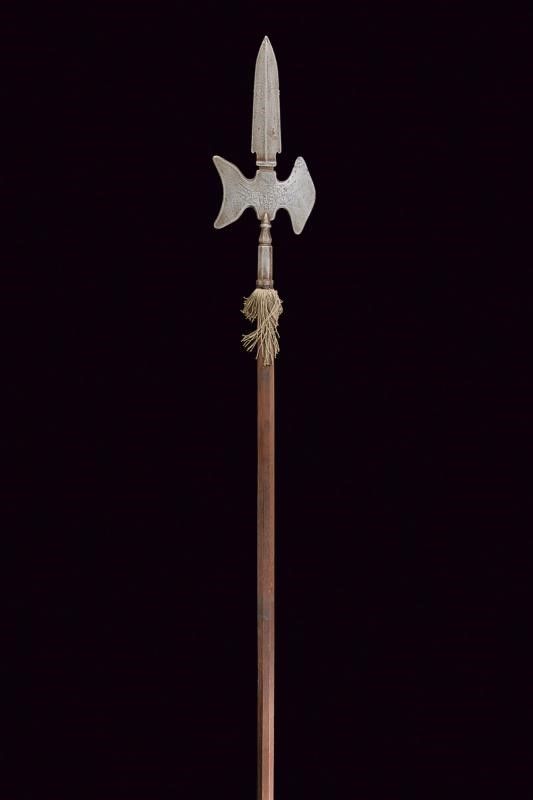 dating: Late 18th - Early 19th Century provenance: Naples, Spearhead with bladed cusp with central cannelure; the axes, one convex and one concave, finely engraved on both sides with the Bourbon coat of arms surmounted by a crown and on flags; faceted ferrule with straps numbered '98' and marked 'S'; faceted wooden shaft with iron foot and tassel. Very rare. Ferdinand IV era (1759-1799, 1799-1806 and 1815-1816). height 208 cm.
