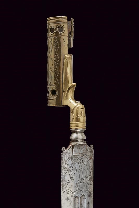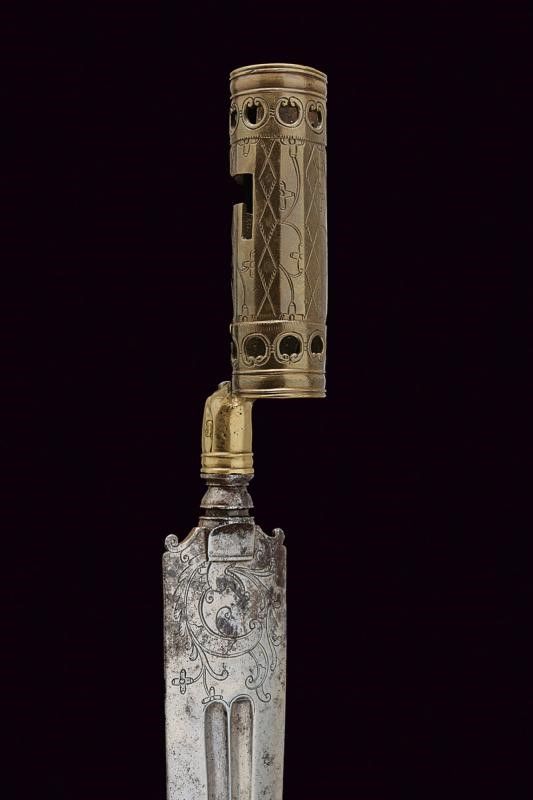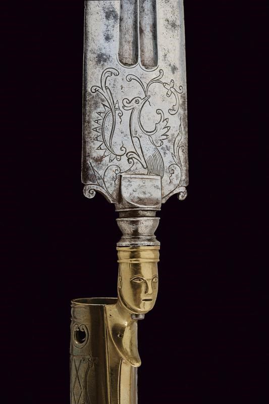 dating: circa 1800 provenance: Southern Italy, Straight, double-edged blade with slightly enlarged tip, with double fuller, featuring grotesque engravings at the base. Turn-off blade, it can be mounted on a knife handle. Brass socket and base. The former faceted, engraved and partially pierced, the latter worked with protome with an anthropomorphic face. Antique (pertinent?) leather scabbard with iron mounts with pitting, belt hook. length 37,5 cm.