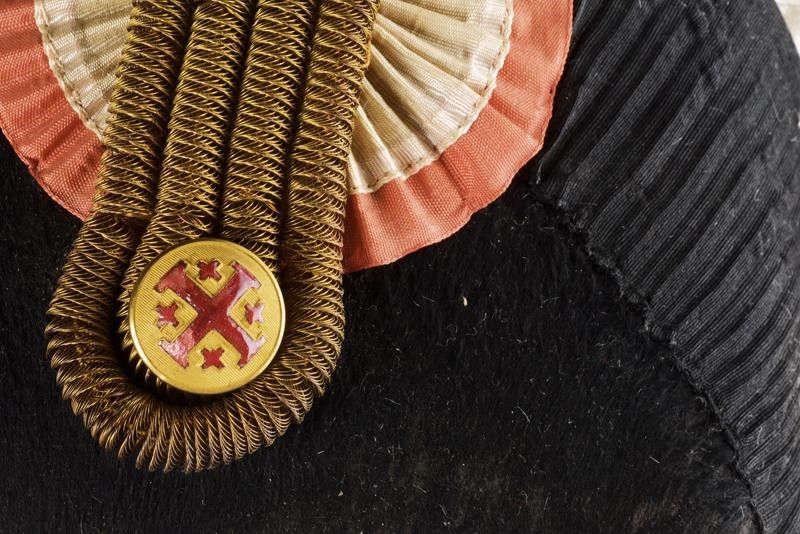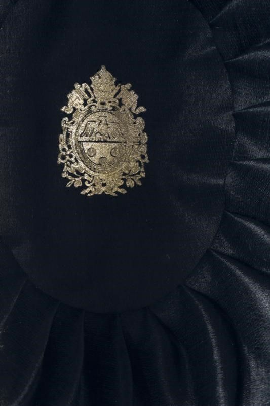 dating: Mid 20th Century provenance: Papal States, Made of black coypu with black fabric chevron, white plumage, gilded threads noose, white - red silk cockade, golden button with red enamel crosses, inside black sweat-band and silk cap imprinted with Pope Pius XI's coat of arms. Together with a black velvet bib with silver embroidery and all its golden buttons with red enamel crosses. In its original zinc-coated steel plate box. height 12 cm.