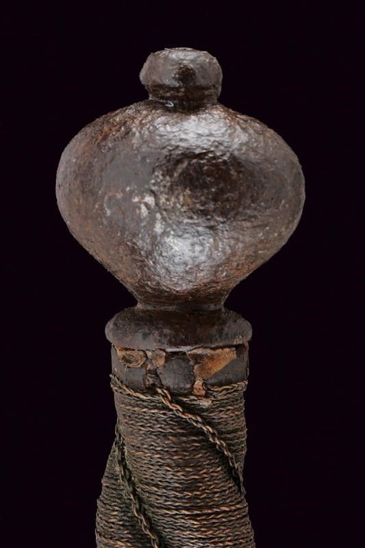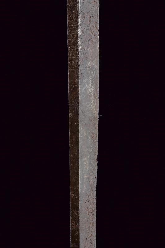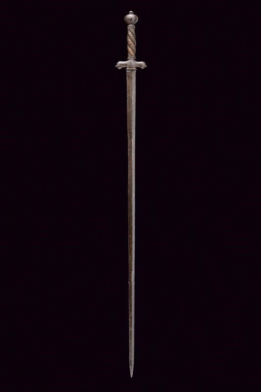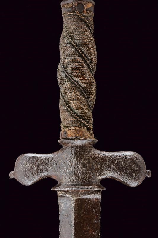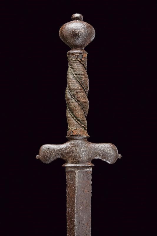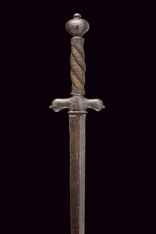 dating: Second half of the 17th Century provenance: Brescia, Straight, double-edged blade with riser toward the back, short tang. English 'pillow sword' type, iron hilt, with wide and short quillons and remains of carved decoration, vase-shaped pommel worked en suite. Wooden grip with coiled copper wire binding, missing Moor's heads. length 105 cm.