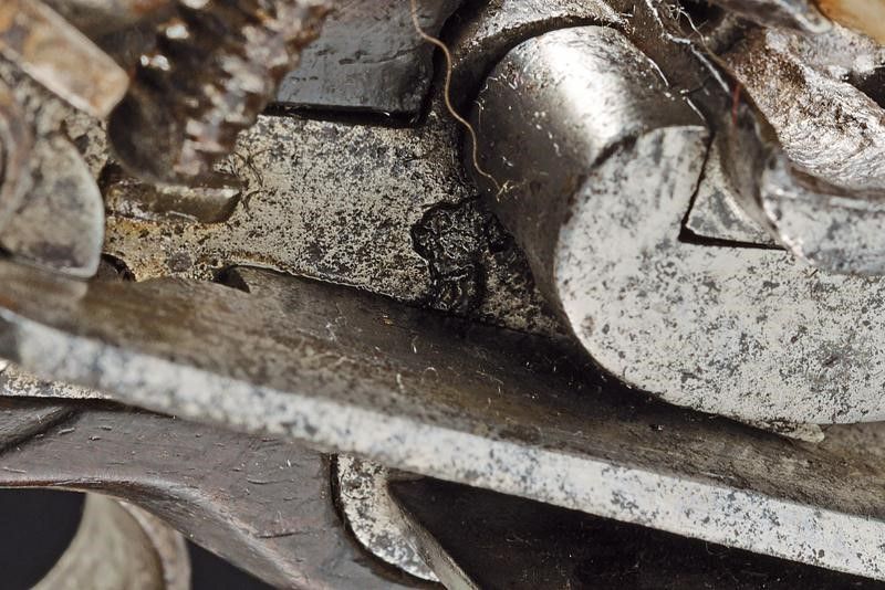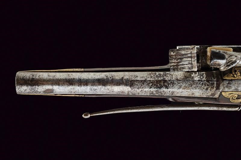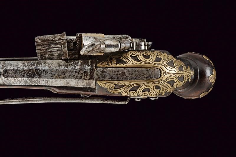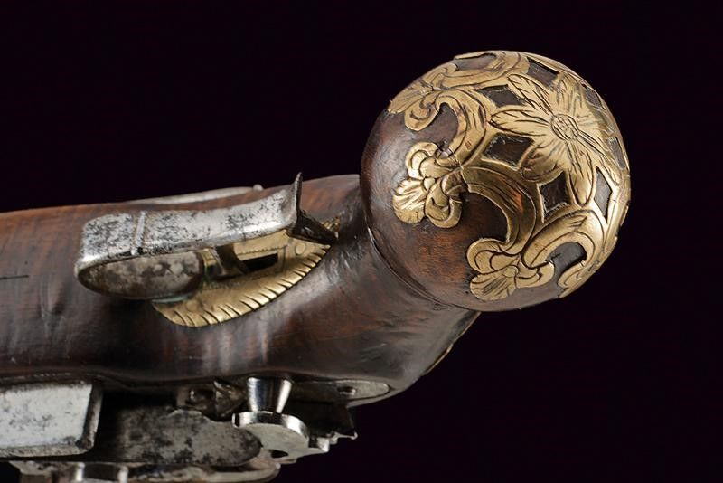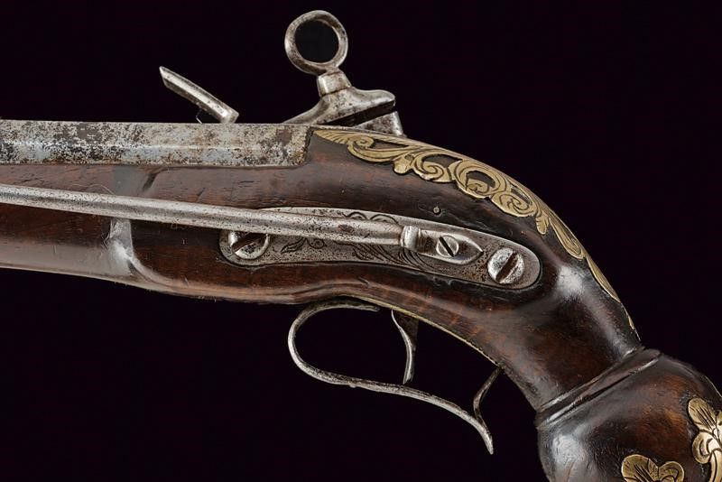 dating: late 18th Century provenance: Ripoll, Two-stage, 17 mm cal. barrel, round and octagonal with a ring at the girdle, areas damaged by rust; flintlock with miquelet lock (one tooth of the cock screw is missing); wooden full stock with spherical butt-plate (one restored crack under the barrel); brass mounts engraved and fretworked with floral motifs, iron trigger guard provided with finger support, also the counterplate of iron, engraved and provided with belt hook. One of the pins of the hilt (marked 'J') and ramrod are missing. length 30 cm.