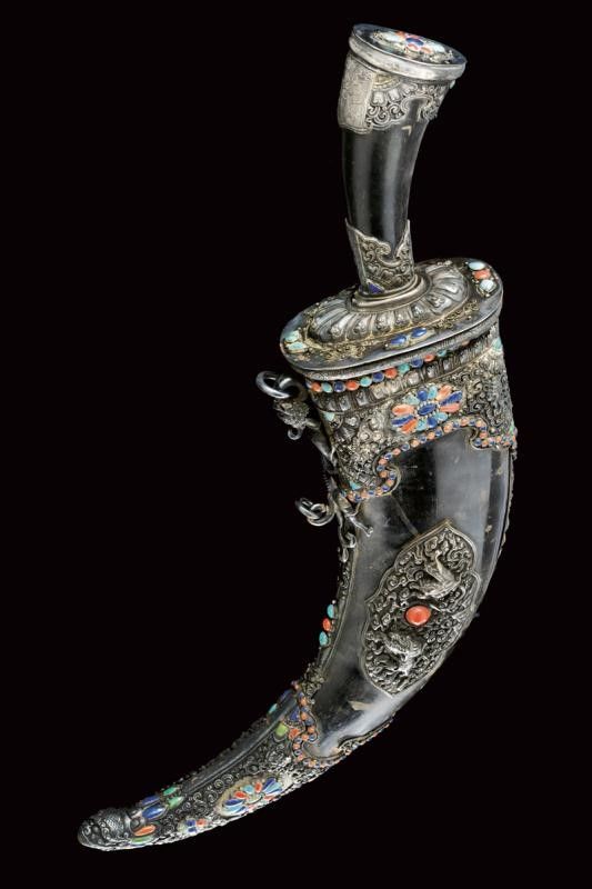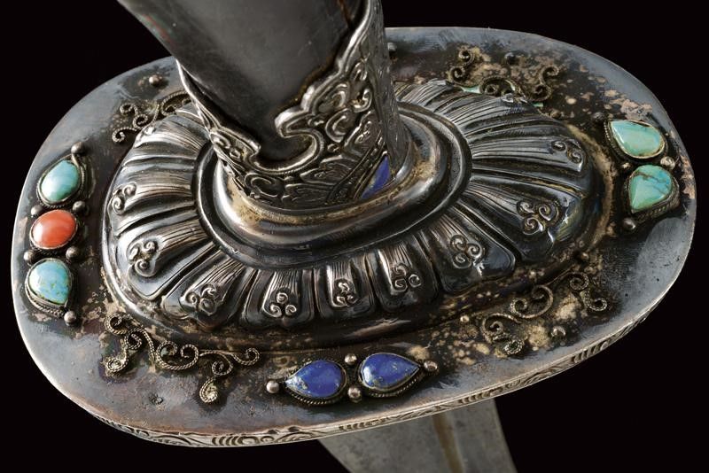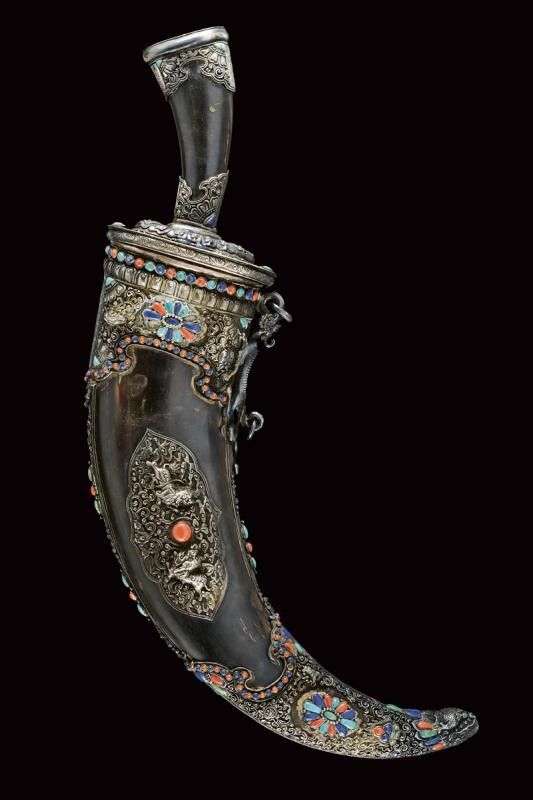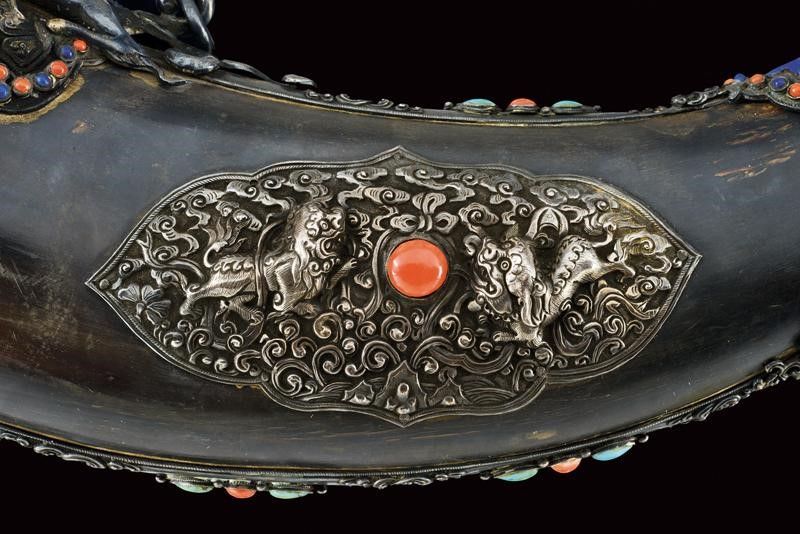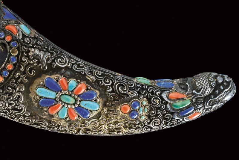 dating: circa 1900 provenance: China, Solid, wide, short, curved, single-edged blade grooved on both sides. Large horn grip with silver mounts engraved and embossed with floral and geometric motifs, decorated with coloured stones. Impressive horn scabbard with impressive embossed-silver mounts engraved with dragons and floral motifs. Chape shaped as a dragon's head, two suspension rings with a dragon worked in the round. Missing parts and small defects. Beautiful ceremonial short sword with high-quality mounts. Total length with scabbard: 57 cm. length 37.5 cm.