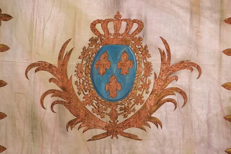 dating: 1830-40 provenance: France or Naples, Made of beige silk, painted on one side with coat of arms with three lilies on a blue background, under crown and with collar of the Order of the Holy Spirit surrounded by two palm branches. On the margin garland of lilies, left side with opening for the shaft, and with fringes in gilded threads on three sides. Rare object still keeping remains of the original gilding. Coming from one of the several royal castles or estates. diameter 104 x 88 cm.