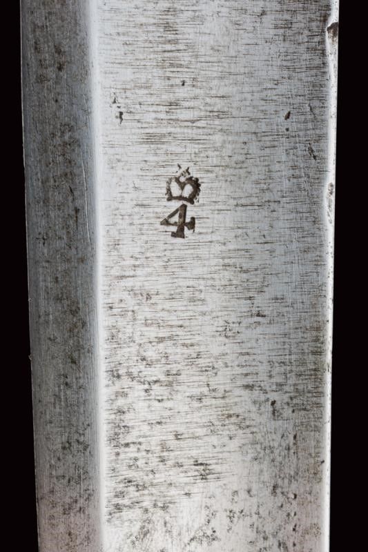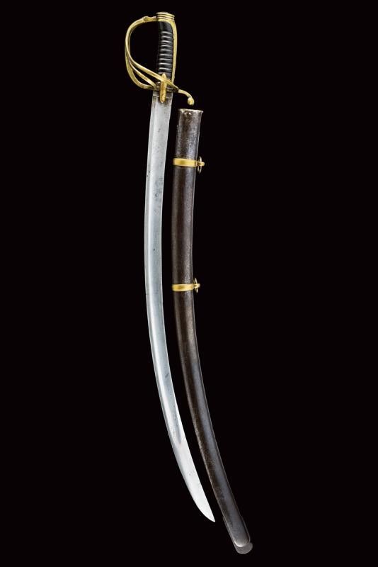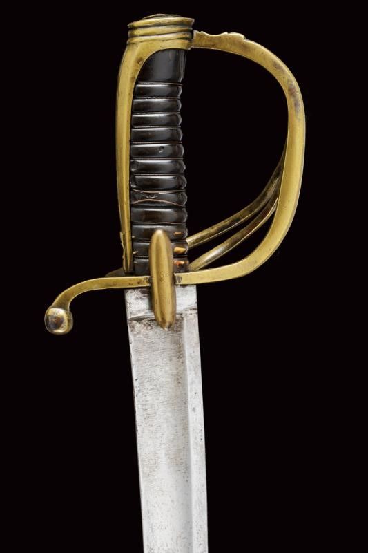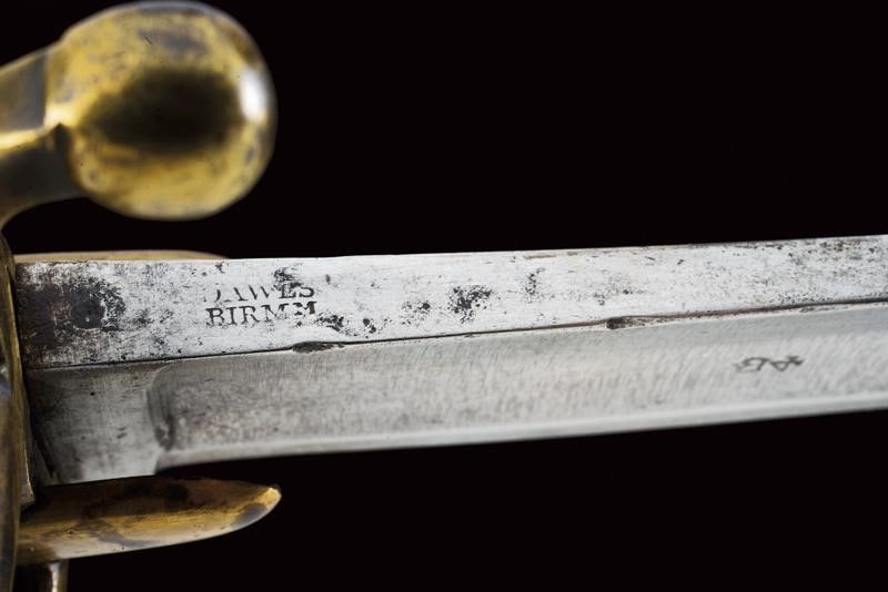 dating: Second quarter of the 19th Century provenance: Kingdom of the Two Sicilies, English, single-and-false-edged blade, with wide fuller and tang, the base marked '4' under crown, the back 'DAWES BIRM.M'. Bronze hilt with sheath-guard wings, three loop-guards, long, three-sided cap, horn grip (small lacks) with coils, metal wire binding. Blackened iron scabbard with two bands, bronze suspension ring. length 95 cm.