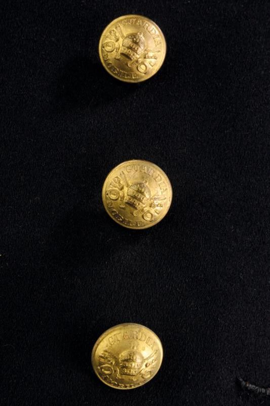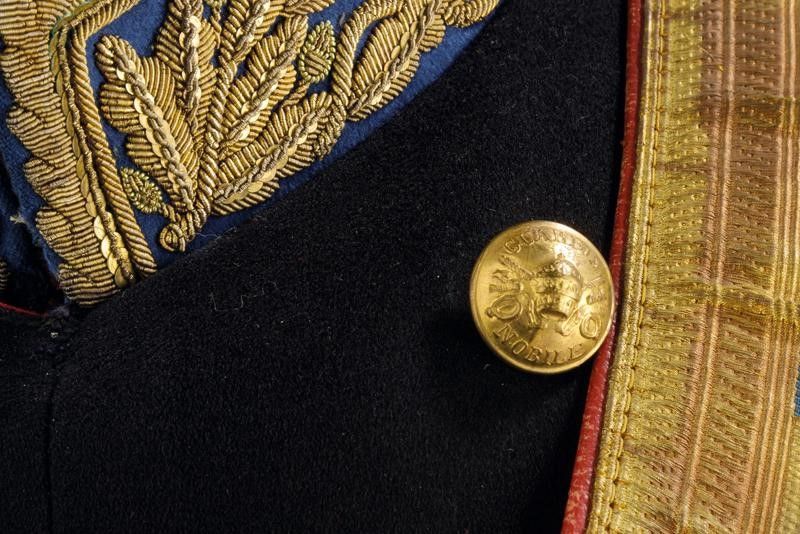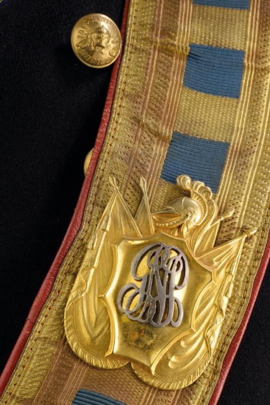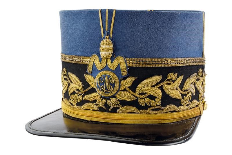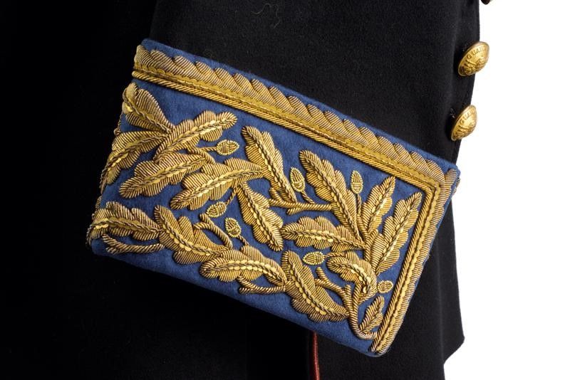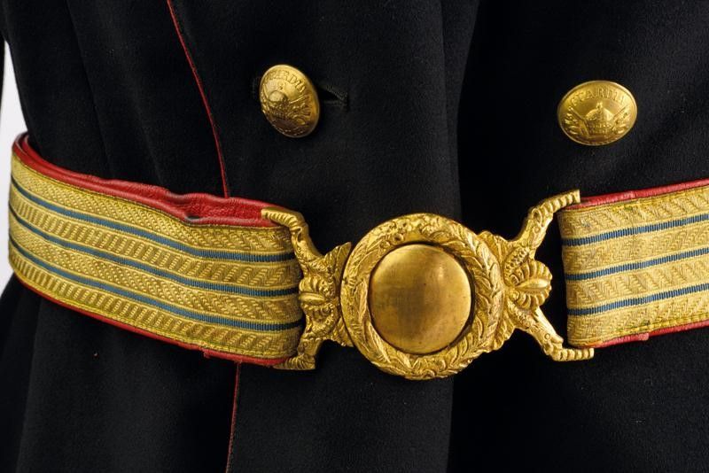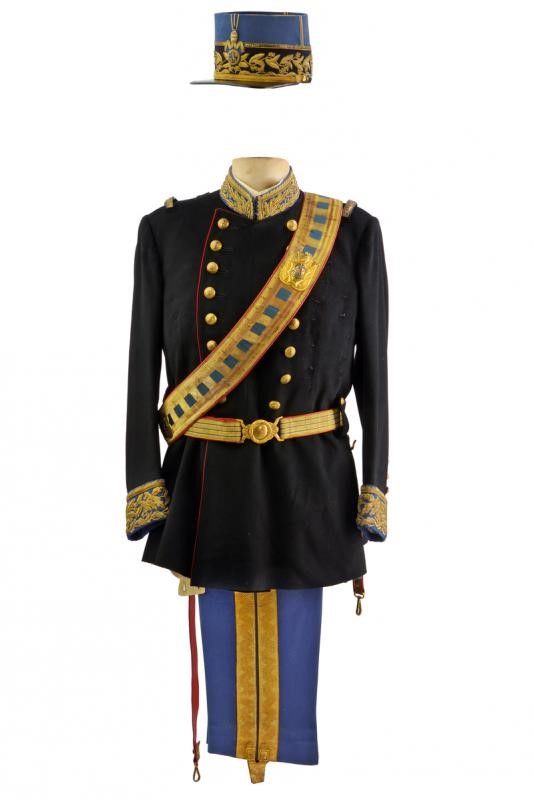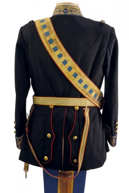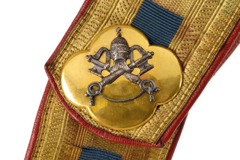 dating: 1963-1970 provenance: State of the Vatican City, Blue fabric kepi with black band, richly decorated in gilded threads, with a tiara with 'GN' monogram for Noble Guard. Leather sweat-band and white silk lining. Black cloth jacket with blue collar and cuffs, decorated with gilded-threads floral motifs. Loops for the epaulettes (missing), buttons with tiara and inscription 'GUARDIA NOBILE', on the chest buttonholes for the orders. Complete with red Morocco leather belt with gilded stripe and blue bordering, complete with clutches for the sabre, bandoleer worked en suite and provided with gilded metal papal badges, one with silver 'GNP' monogram of the Noble Guard, the other with decussate keys and papal tiara. Blue fabric trousers with double gilded stripe, provided with buckles on the lower border with ankle loops. The Noble Guard was dissolved by Pope Paul VI in 1970. height 81 cm.