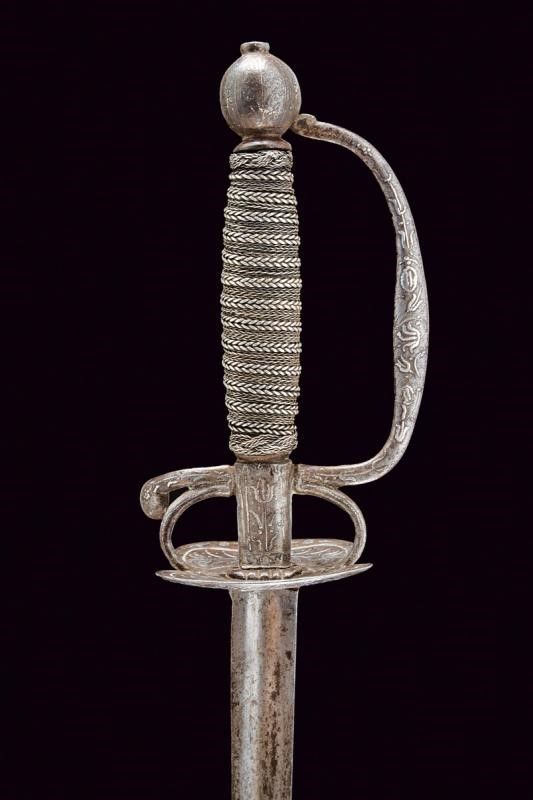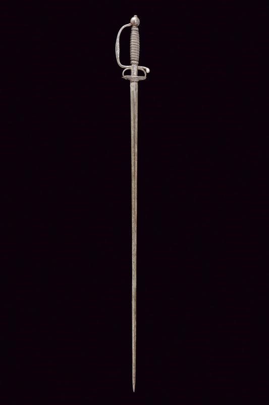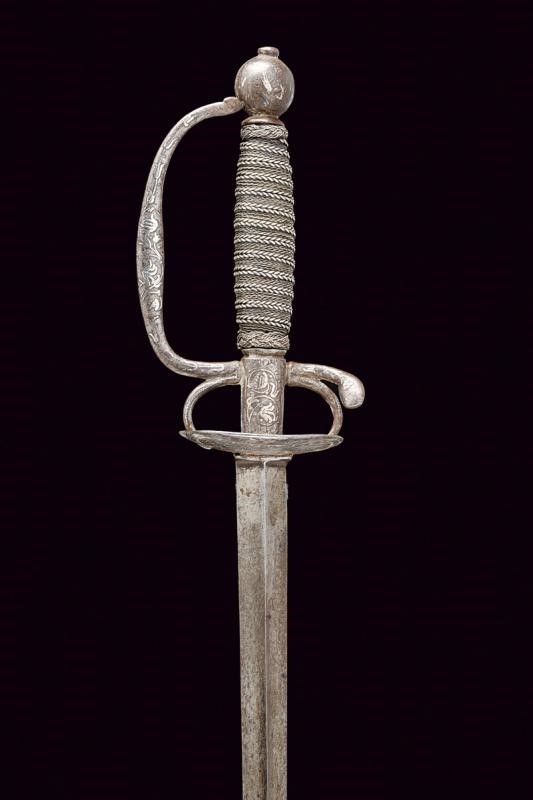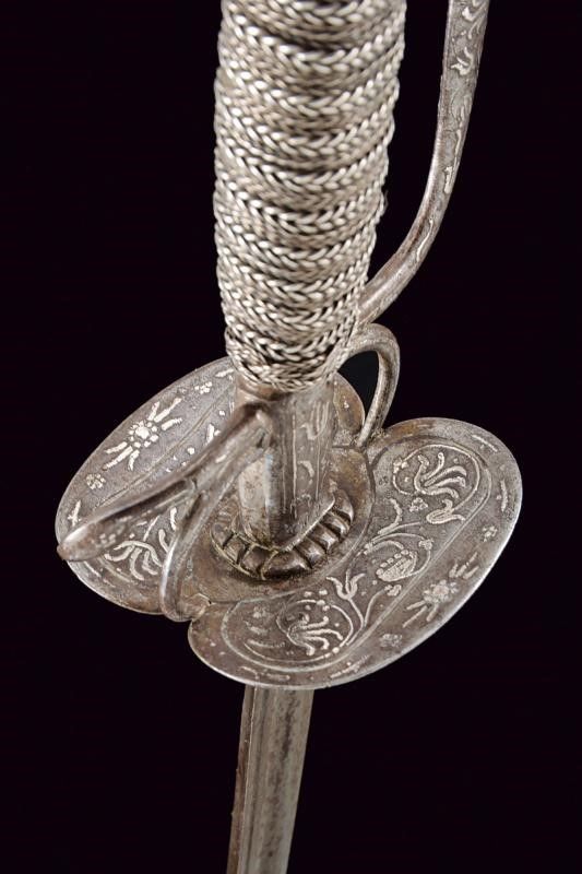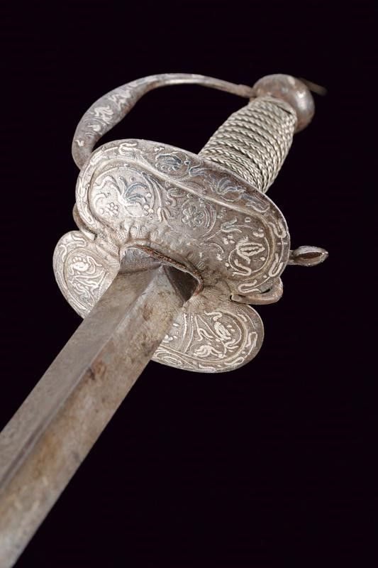 dating: 18th Century provenance: Germany, Blade of triangular section with hollow sides. Double-valve iron hilt, arms of the hilt, quillon , loop-guard and pommel decorated with silver floral motifs, one vale decorated with a figure on one side. Wooden handle covered with wire binding and silver-threaded Moor's heads. length 98.5 cm.
