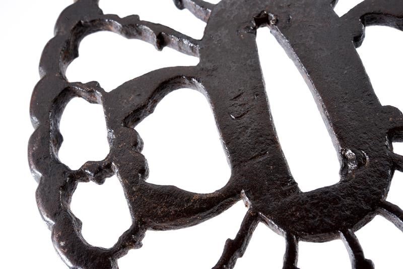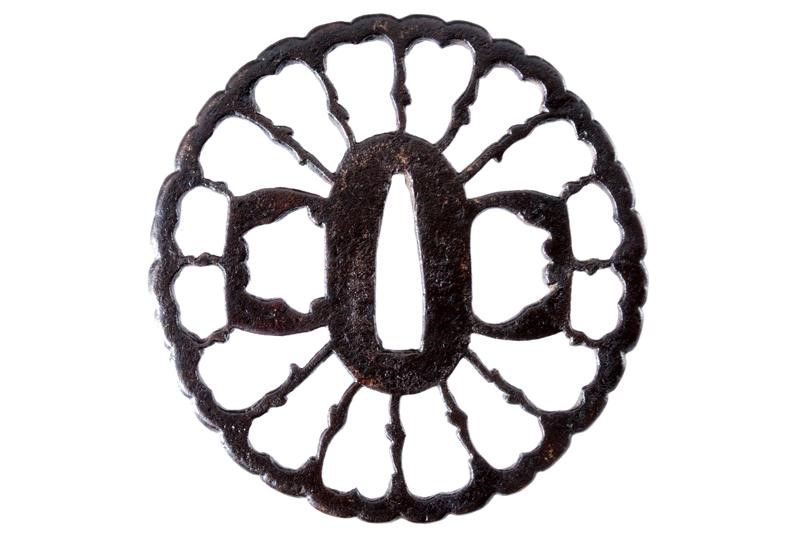 dating: Period (1603-1867) provenance: Japan, Made of iron, kikka-gata, sukashi-bori, shaped as a chrysanthemum with stylised birds in flight. Both hitsu-ana shaped as a ginger flower (in negative). Mei: Masakazu. Kaku-mimi. Late Edo period, around 1800. See Compton I, no. 48.Illustrated and described in Japanese, English and German in 'Tsuba' by Günther Heckmann, H.U.B. Verlag Nürtingen, 1995. No. T129. dimensions 8.4 x 8.4 x0.4 cm.