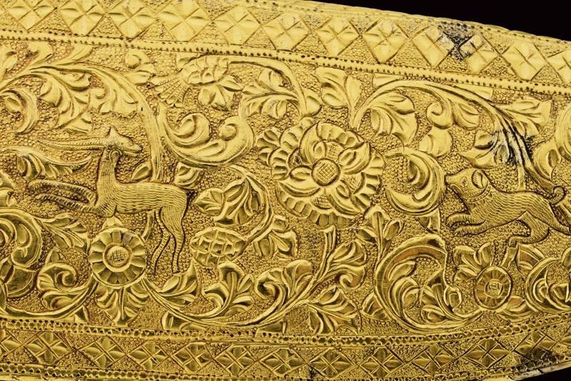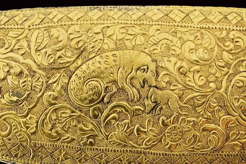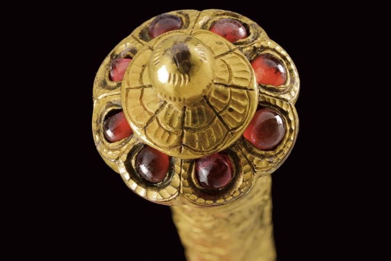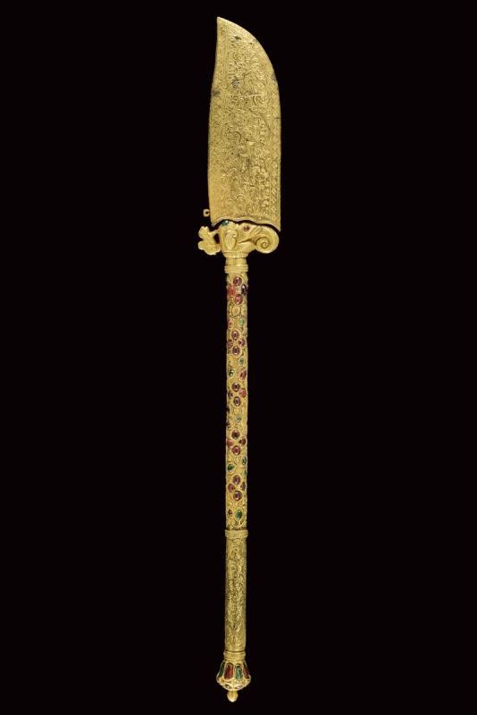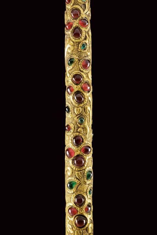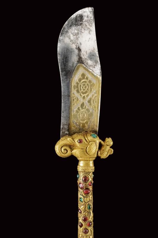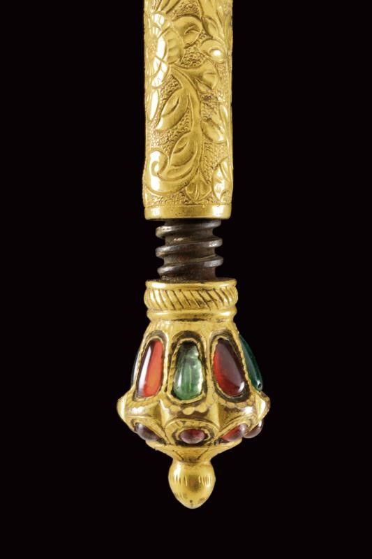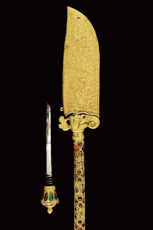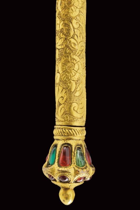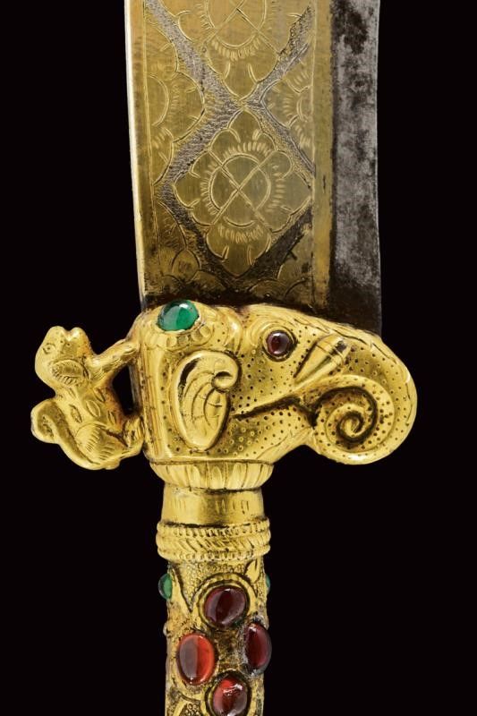 dating: Mid 19th Century provenance: Kutch, Heavy, wide, single-and-false-edged blade with a slightly hollowed and ribbed tip; decorated with gilded silver floral motifs on a granulated background at the first part and at the back. The base of the blade held by a beautiful hilt shaped as an elephant's head, gilded and decorated with green and red stones, as the cylindrical, bronze shaft decorated en suite and finely engraved with floral motifs. Lantern-shaped pommel with a turn-off, bud-shaped button containing a single-edged knife with silver-plated grip inside. Beautiful, gilded-silver scabbard with fine engravings, depicting matching floral motifs on a granulated background; the inner part made of wood and partially covered with red velvet. A small suspension ring. The name Bhuj probably derives from the name of the city of Bhuj, the former capital of Kutch, and today part of Gujarat. According to Elgood, the name Bhuj is unknown in Rajasthan or Deccan. Literature: Civita, 2014 'Islamic Arms and Armours from Frederick Stibbert's Collection', p. 78, illustration 73.'Islamic and Oriental Arms' by Robert Hales, see three Bhuj of this type on page 300 no. 720 (a-c), the one at the centre is partially decorated with coloured stones like our item, but all three are exceptional like our piece. length 52 cm.