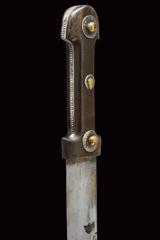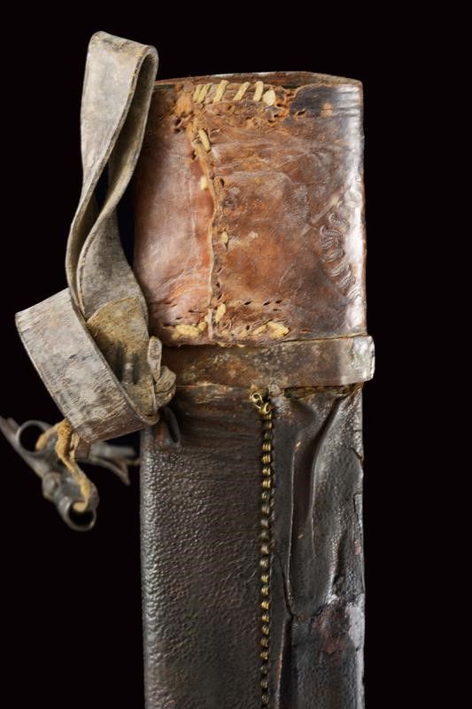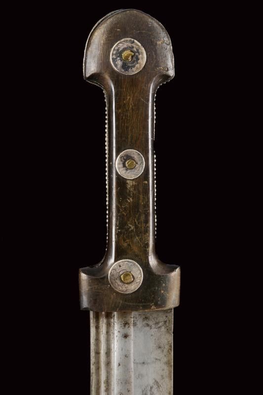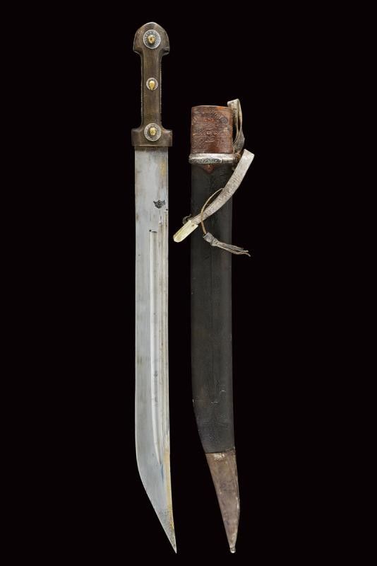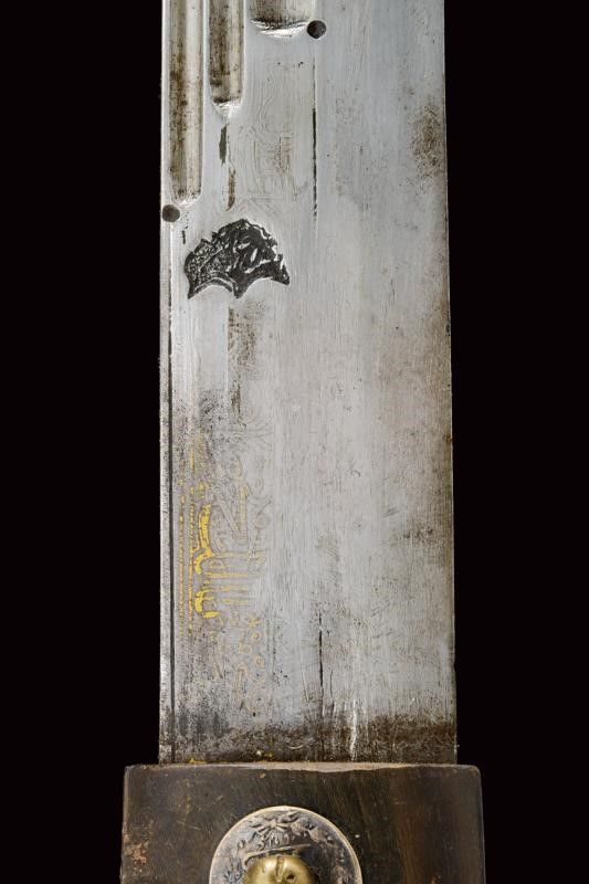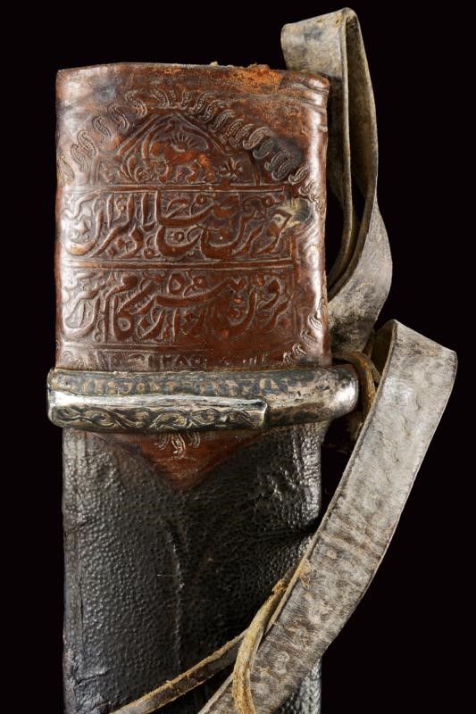 dating: 19th Century provenance: Caucasia, Solid, wide, single-and false-edged blade, the first part of the right side with inscriptions and decorations (still visible) and with remains of gilding, at the beginning of the three grooves a large, deep Arabic mark. The tip with gold decorations. The other side with three grooves. Hilt of typical shape with horn grips, silver central band and three rivets decorated with silver Arabic coins. Wooden scabbard covered with black leather, iron loop covered with engraved and nielloed silver foil (damage), brown leather cap with imprints of Arabic inscriptions. Iron tip. Three leather pendants with small silver mounts. length 73 cm.