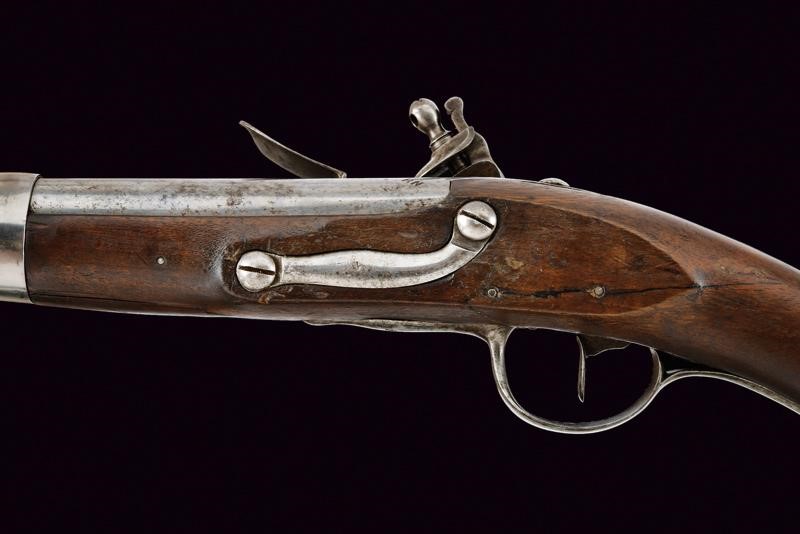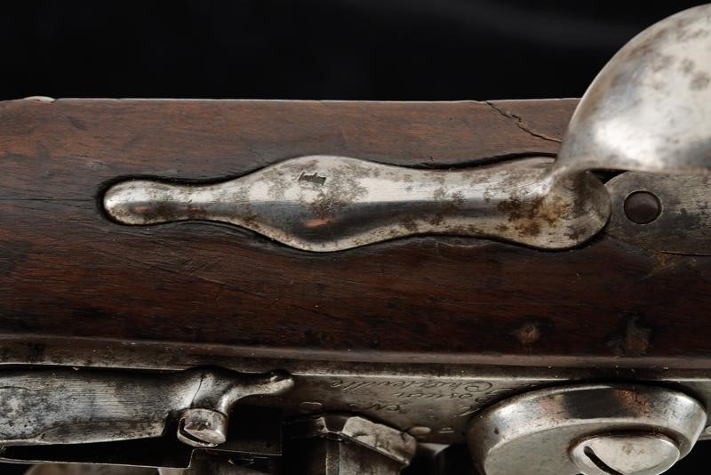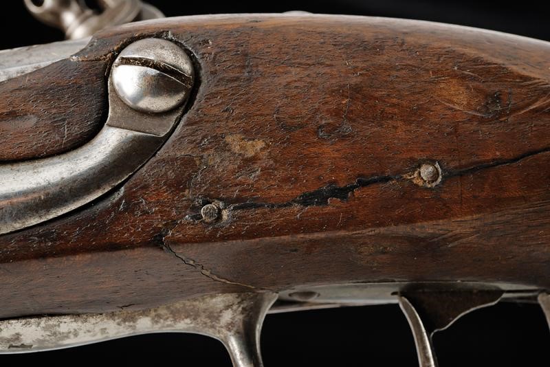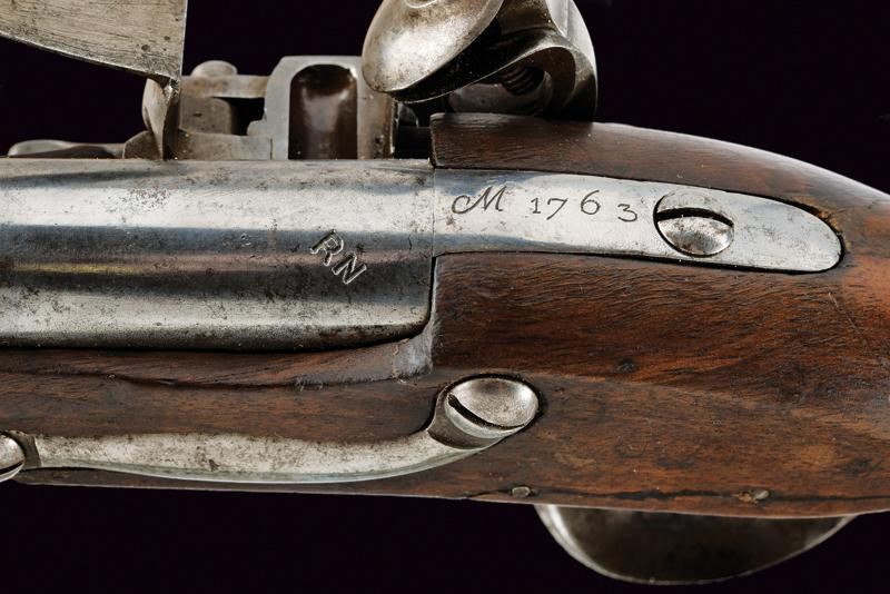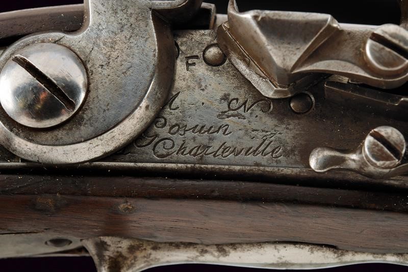 Smoothbore, round barrel marked with "RN", 18.5 mm cal. at the nozzle. Tang with clearly visible mark of the model "M 1763". Lock marked "Gosuin a Charleville", "F" and "M.N." Working mechanism. Wooden full stock (restorations), iron mounts. Ramrod marked
