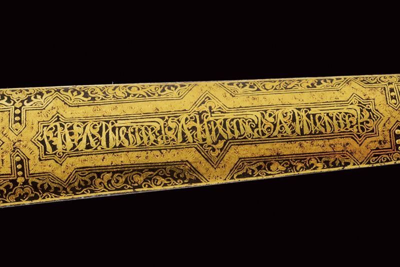 Lama dritta a due fili di sezione lenticolare, inciso per met‡ a motivi floreali su fondo nero, con base recante scudetto in oro con monogramma "M" su un lato e banda in oro marcata "DVX" sull'altro. Impugnatura tipica e fodero con finissime agemine in or