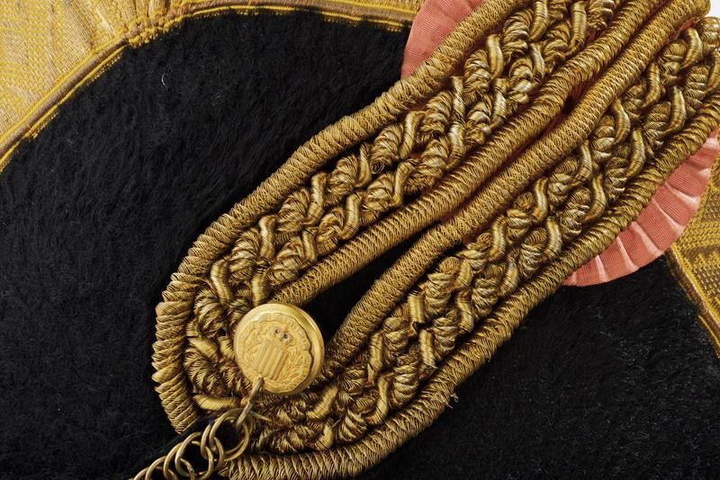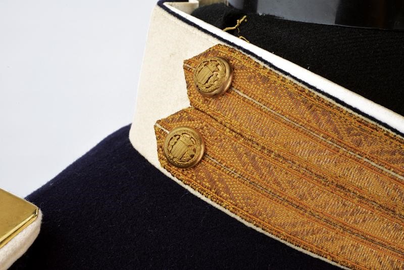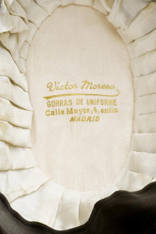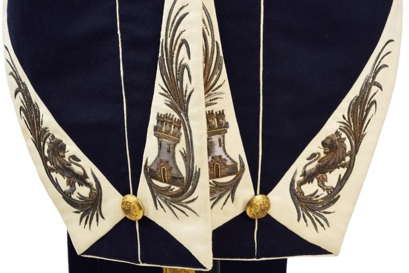 The bicorn of black felt with gilded chevron, gilded threads stripe, cockade, button with coat of arms and chain. Interior with leather sweat-band and white silk cap, both stamped by a Madrid tailor. Black fabric tail coat richly decorated with gilt chevr