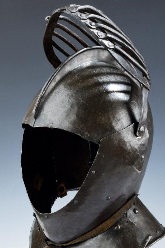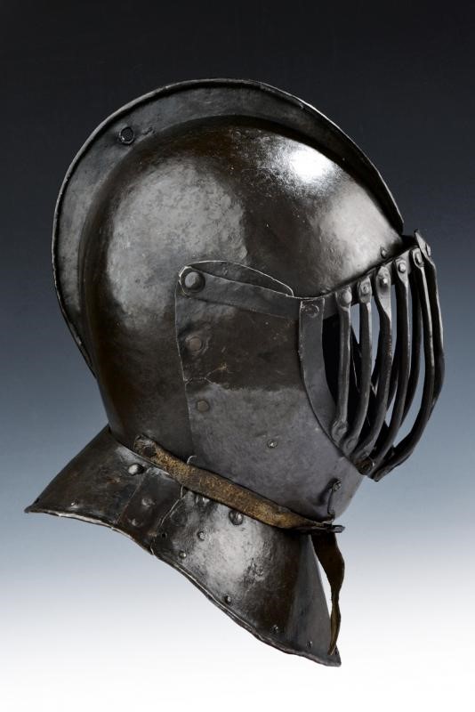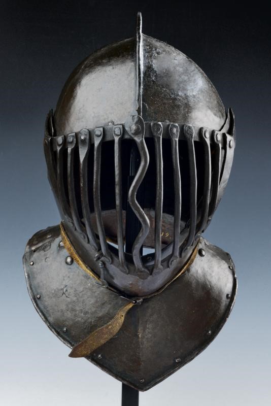 Skull worked in two halves with low comb- Cage visor, undulated bar at the center. Bevor with hook for the visor. Back and front nape-guard plates with rivets (a small restoration). Small defects. In patina.