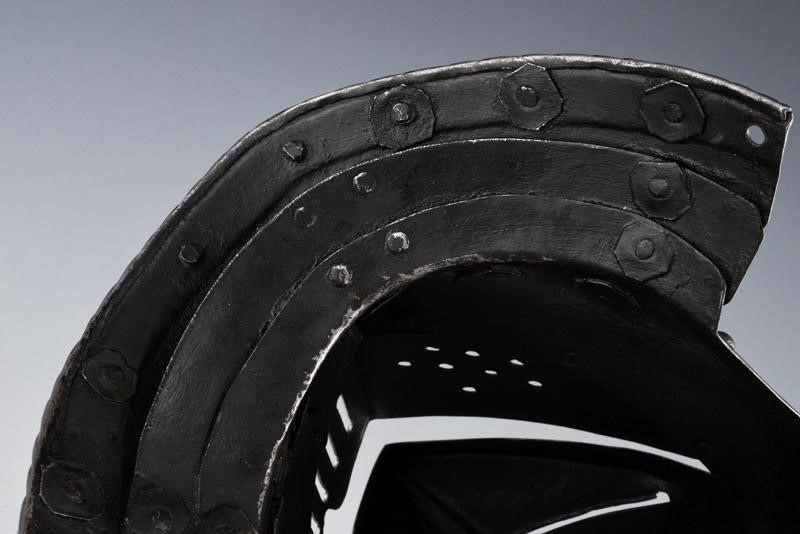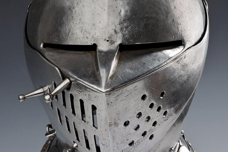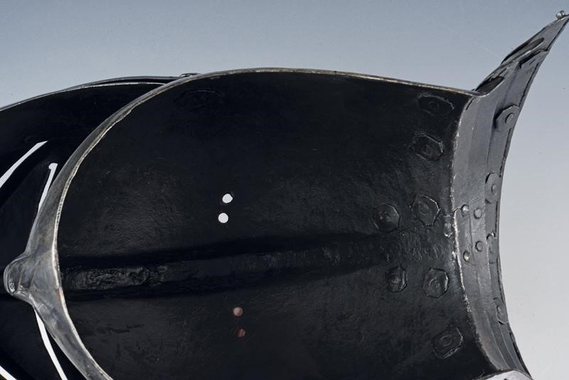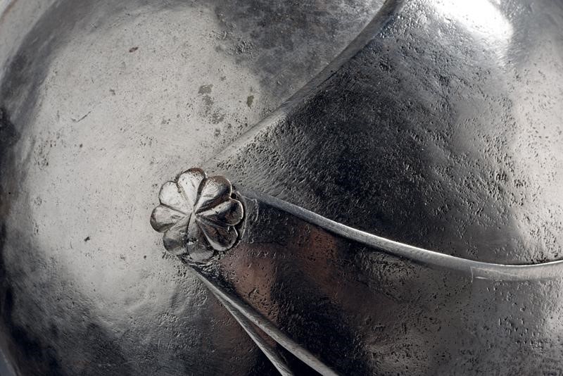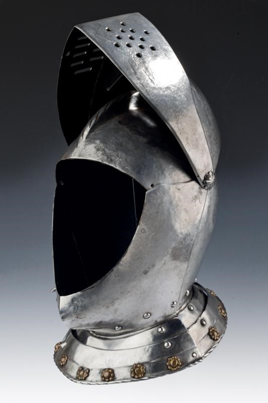 Skull worked in two pieces, with low comb and twisted border, the visor worked en suite with the skull, then ribbed and with eye-slots, opening hinge on the right side; ribbed and richly pierced ventail, provided with another opening hinge and closure fea