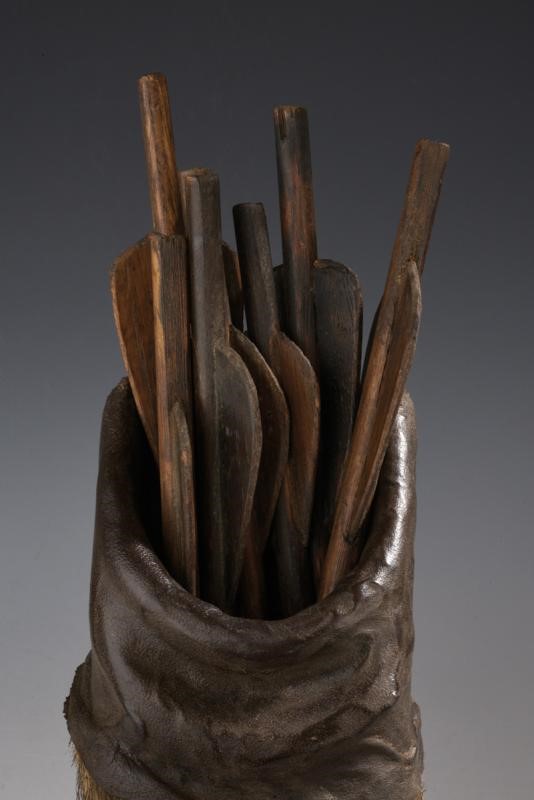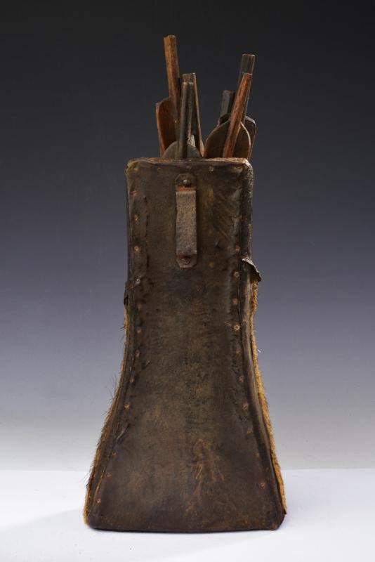 Wooden body covered with wild boar fur, the upper and rear part with leather. Iron loop at the back. Wooden darts with wings, iron tips.