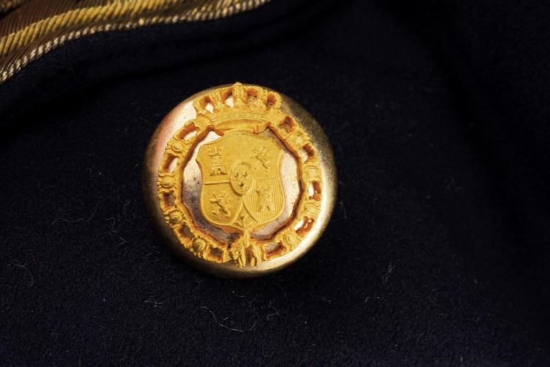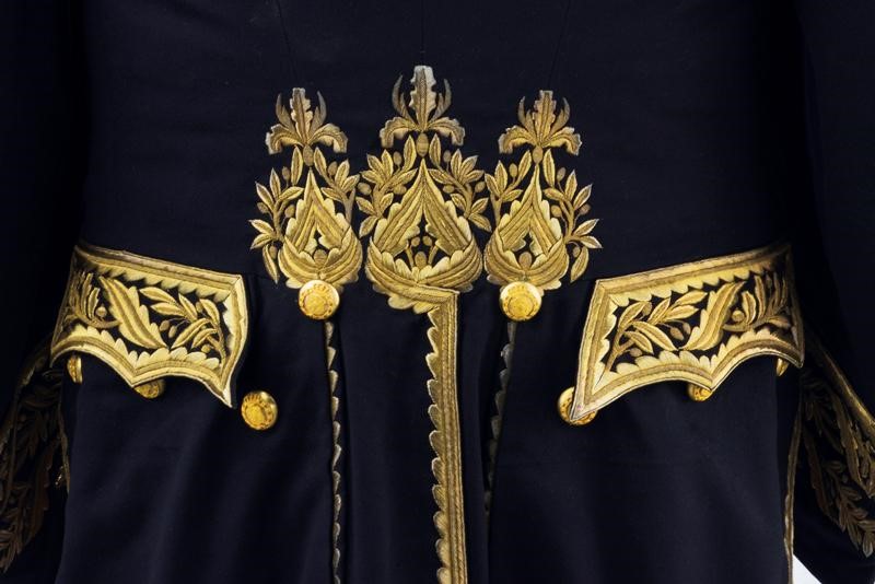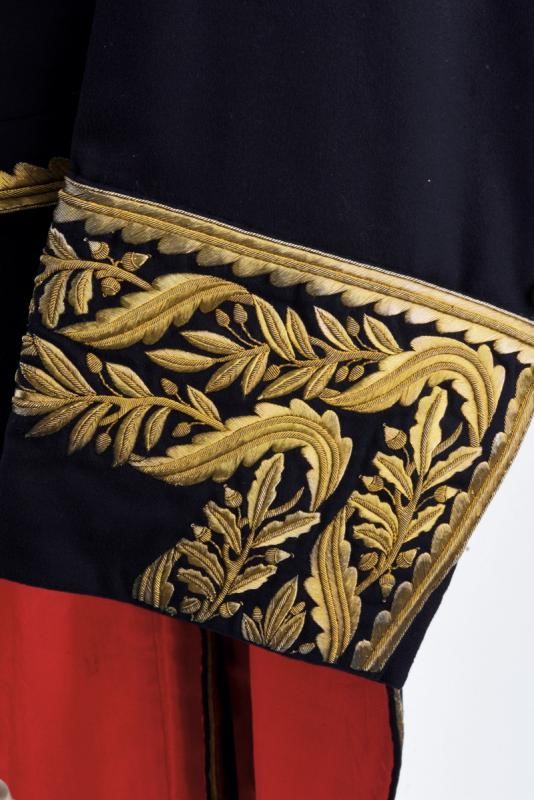 Made of black fabric with black collar and cuffs. Gilded threads decorations. Golden buttons with Spanish Royal coat of arms in the collar of the Golden Fleece. Lined with red silk.