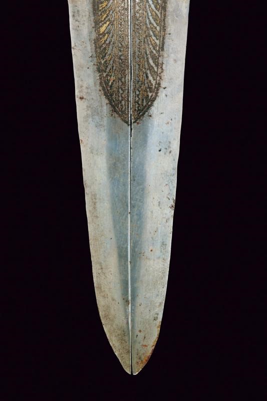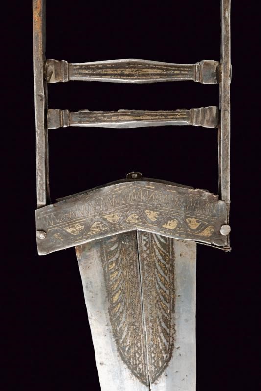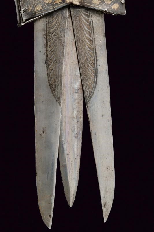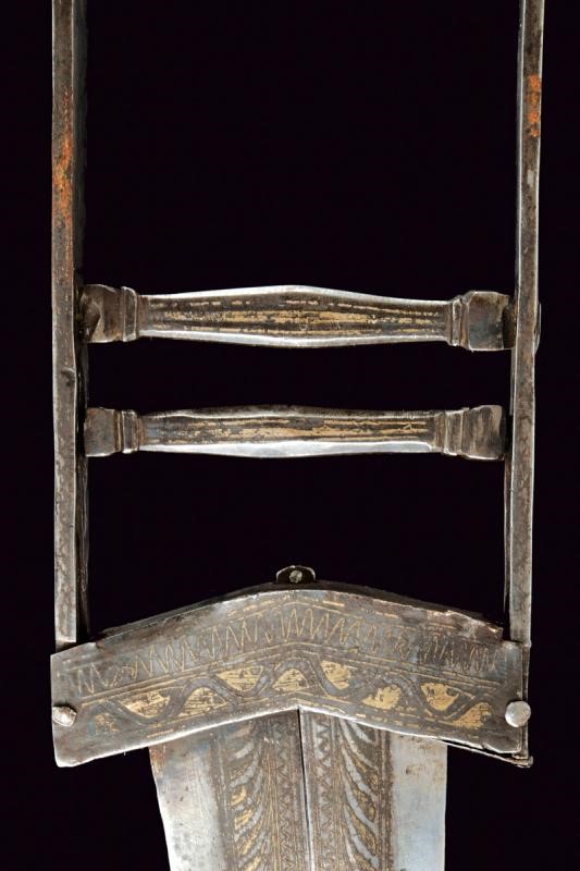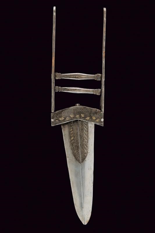 A double-edged blade which can be opened, decorated at the base with silver floral motifs, inside this there is a second blade, which is released by clasping the crossbars of the grip; hilt of typical design, of iron, decorated with silver floral and geom
