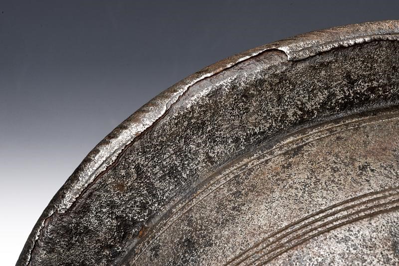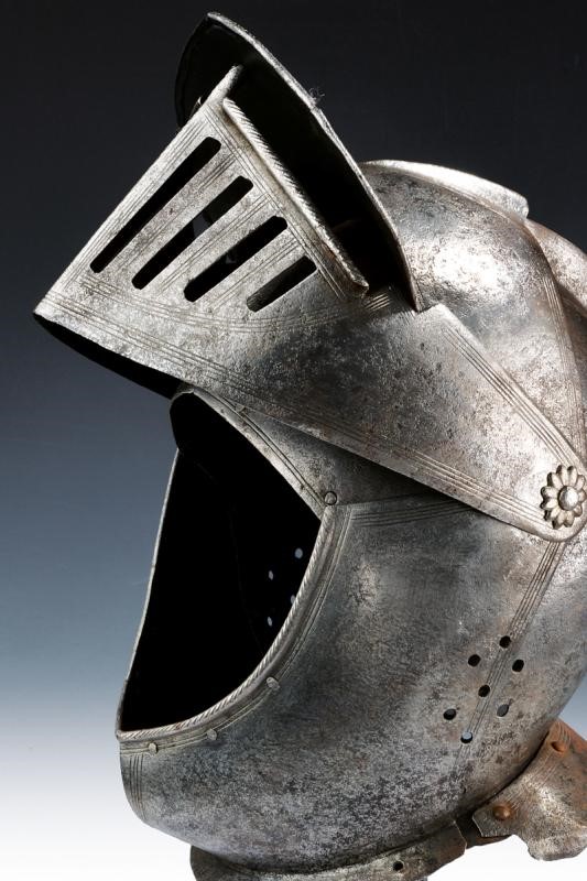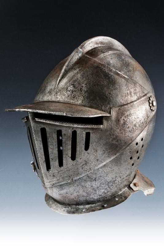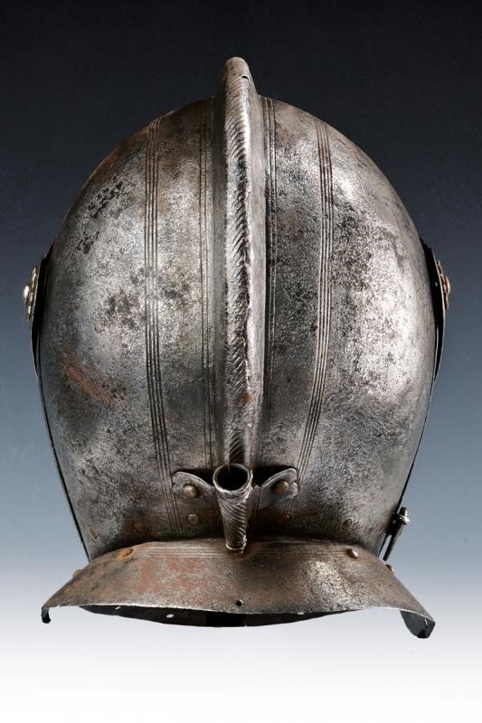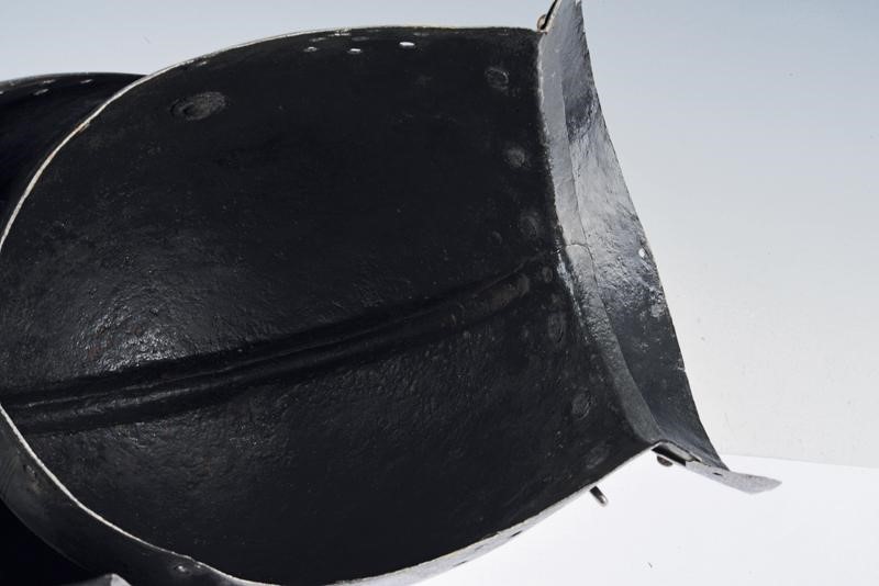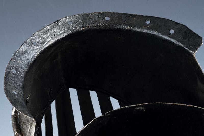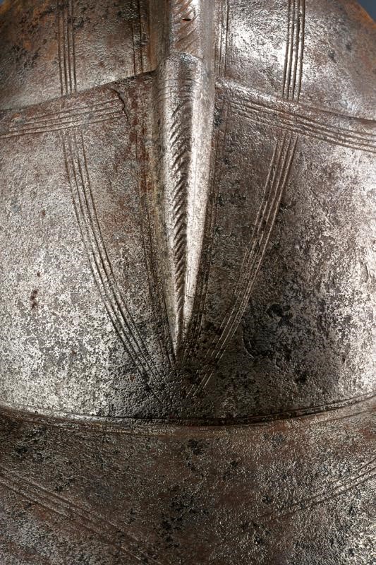 Skull worked into two parts with low roped crest, slightly pointed brim with hemmed roped border, ribbed ventail with four large rectangular openings on both sides and a small cusp in the centre. Bevor with two hooks (for the ventail and the skull) with s