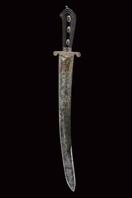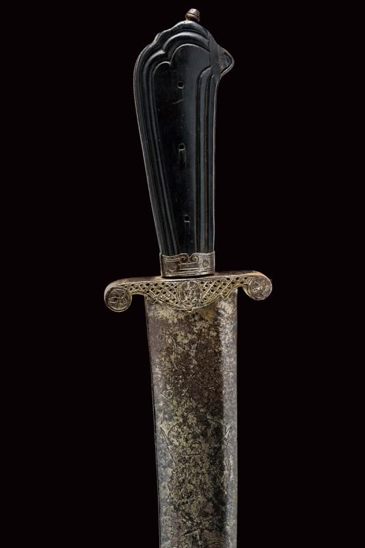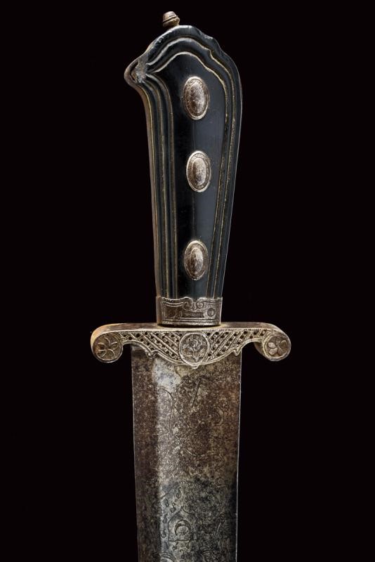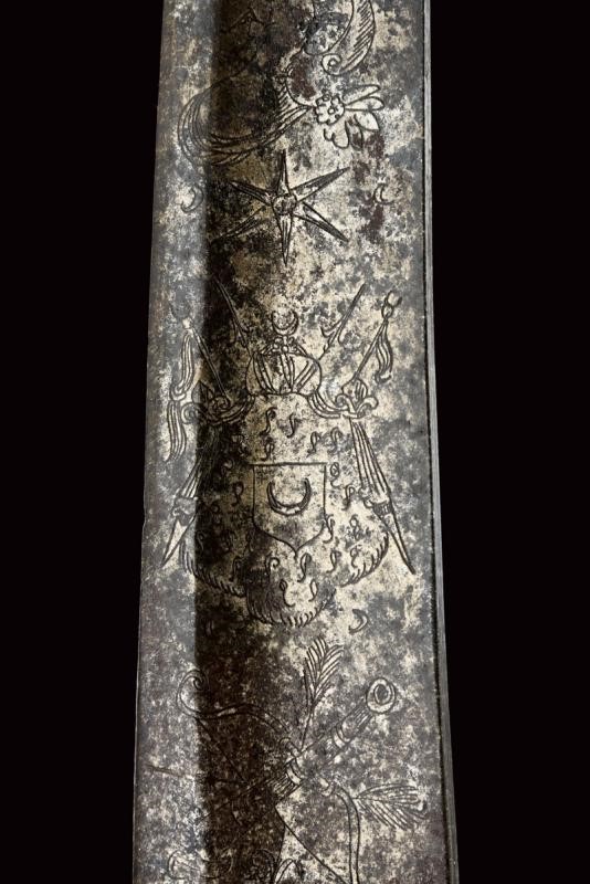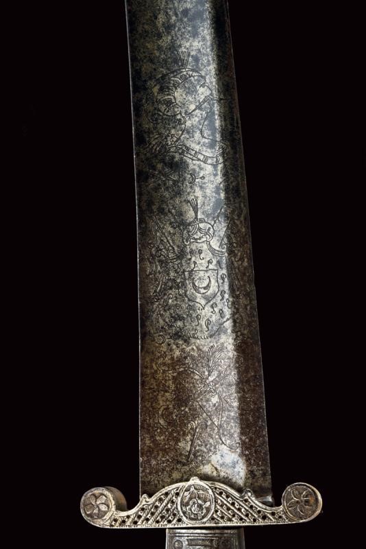 Wide, curved, single-and-false-edged blade, with fuller, finely engraved with pandur, sun, crescent, ermine with crescent under turban, flags and trophy on both sides. Iron quillon richly carved and pierced on both sides. Iron hilt with ebony grip with th