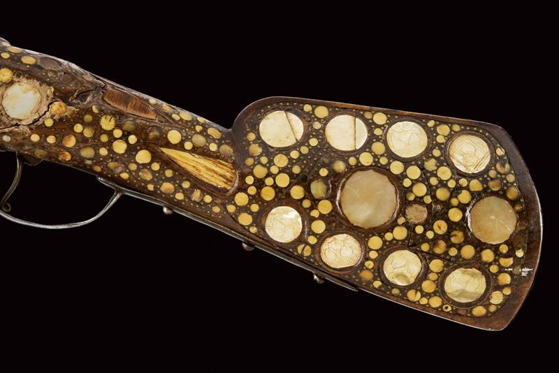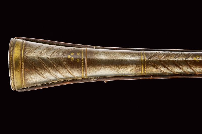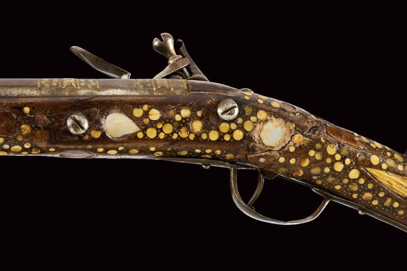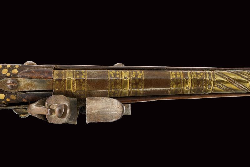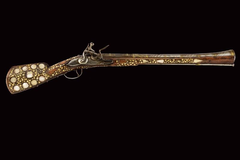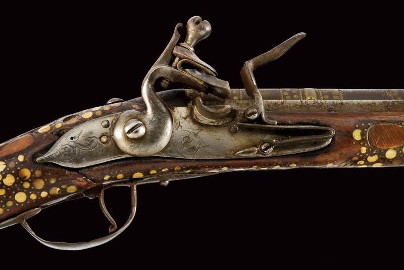 Beautiful, smoothbore, three-stage barrel, octagonal at the first part and then round with round, bell-mouthed nozzle, engraved and with brass inlays over its length. Flintlock with sober floral engravings. Wooden full stock richly decorated with various
