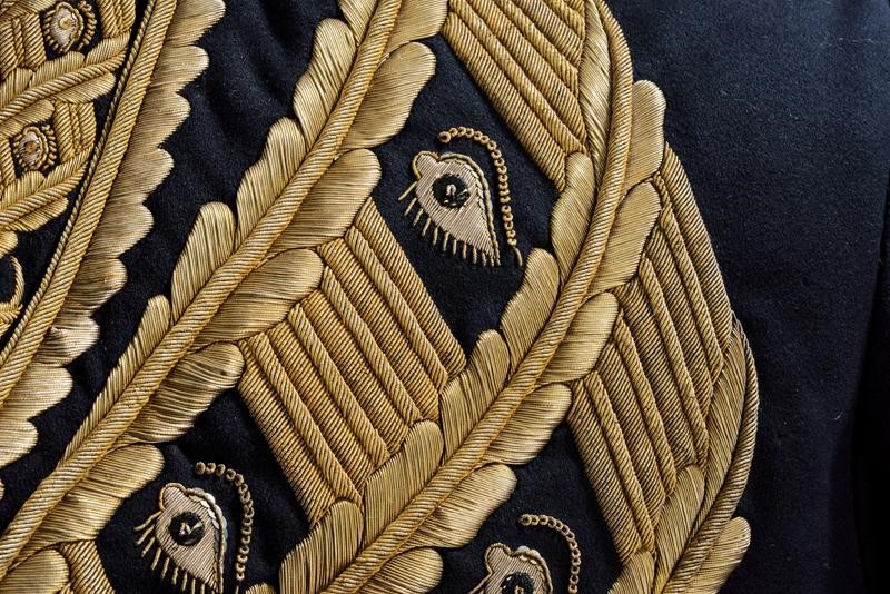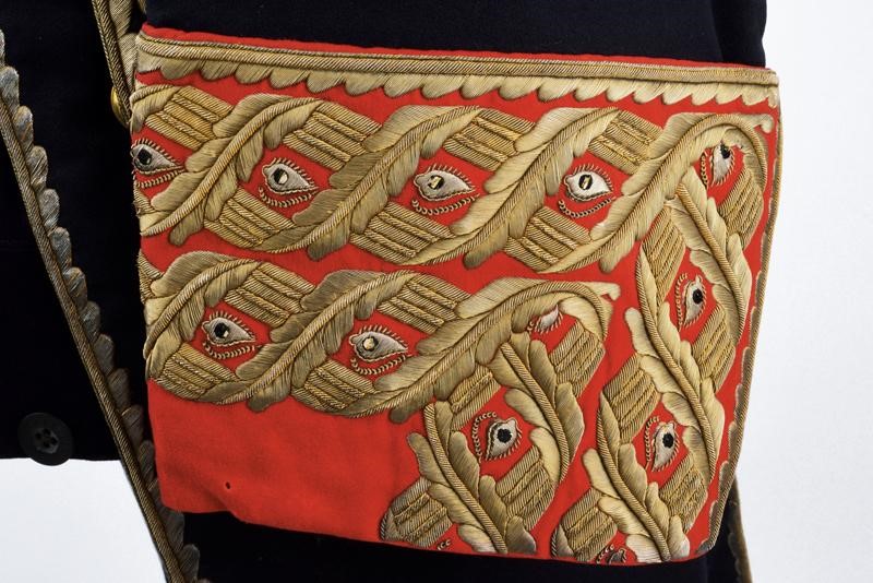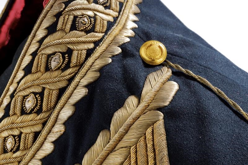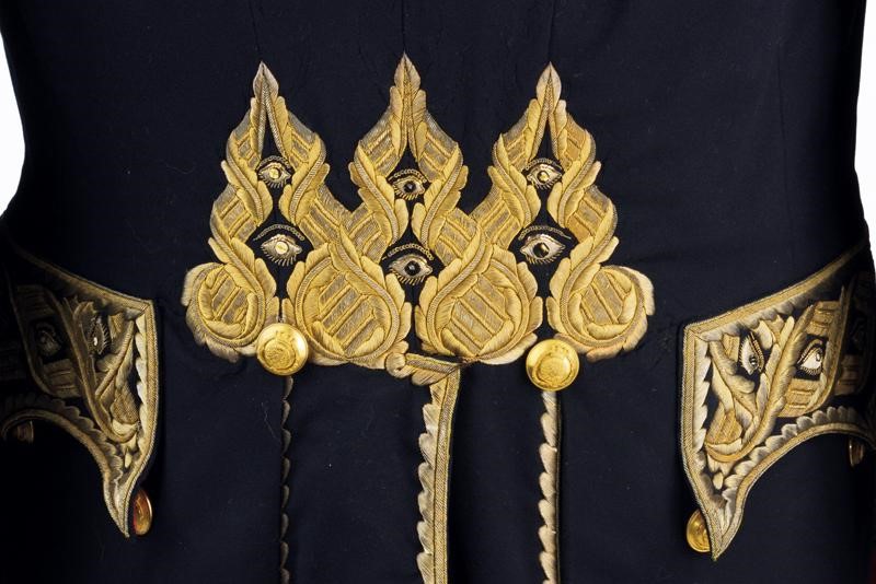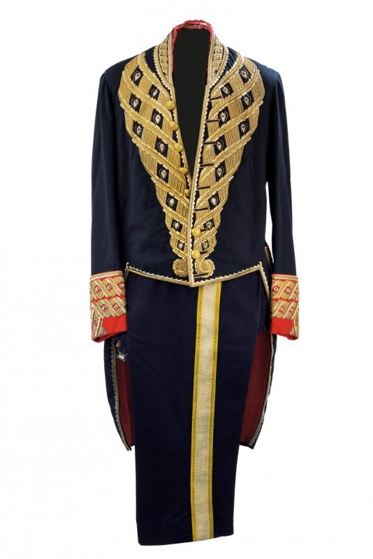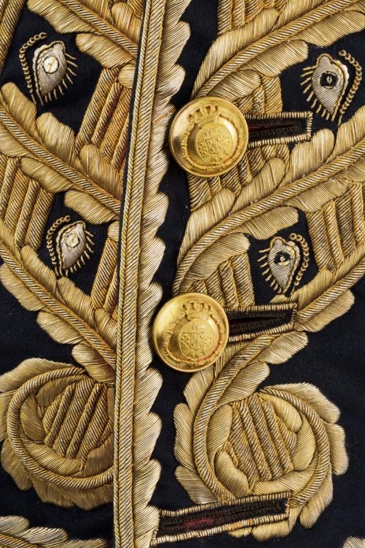 Black cloth tail coat with short black collar and red cuffs, decorated with beautiful gilded threads decorations and gilded buttons with Spanish royal coat of arms within collar of the Golden Fleece. Buttonholes for orders. Lined in red silk (strong signs