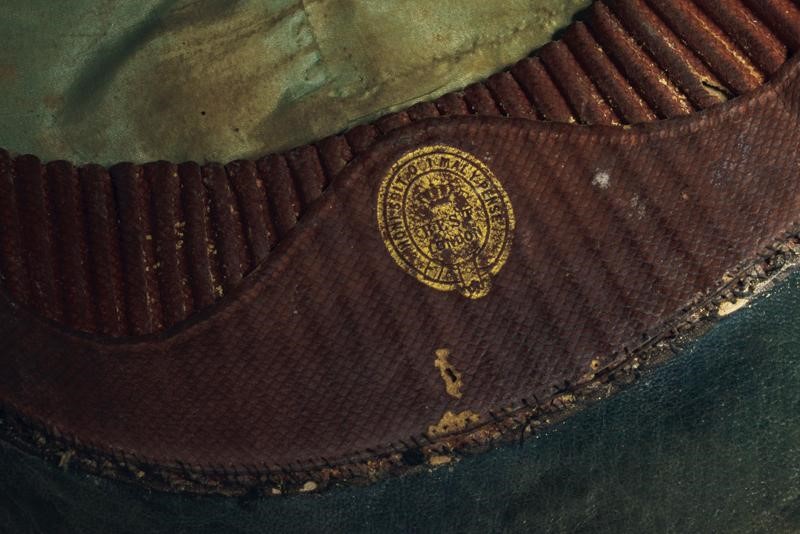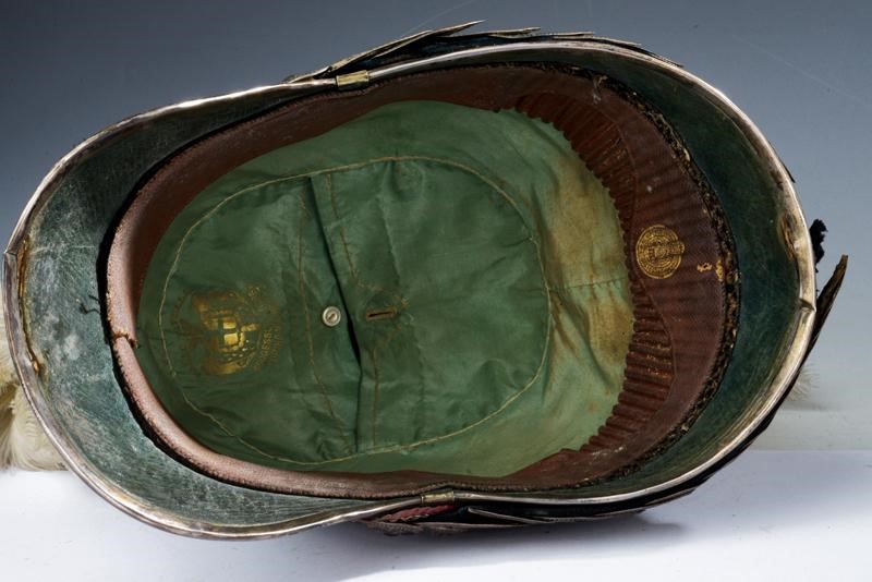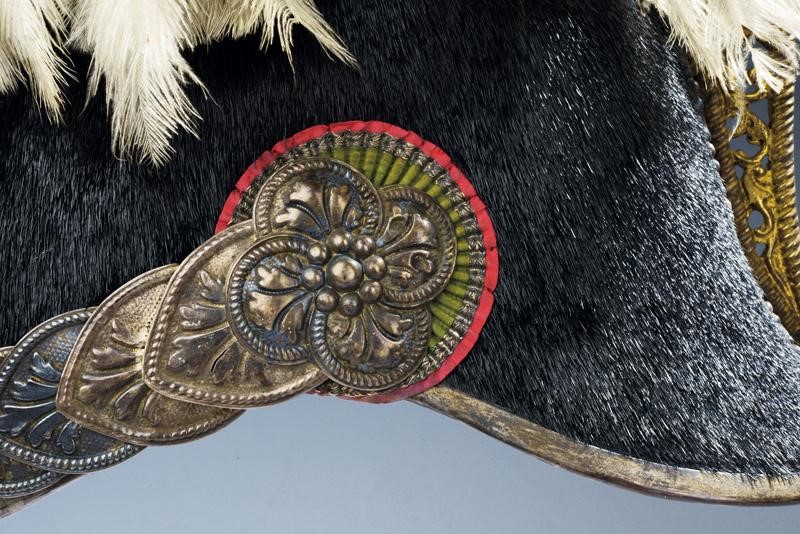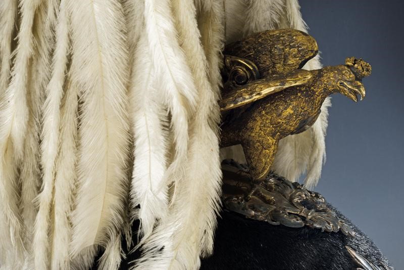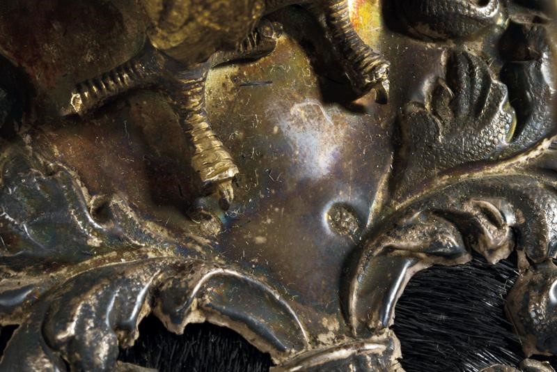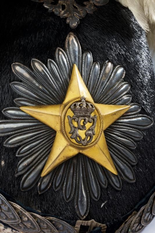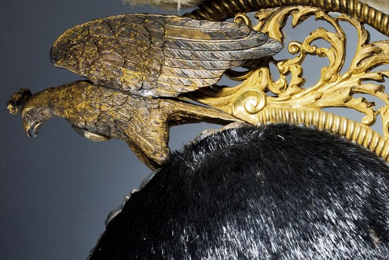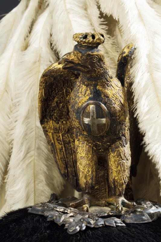 Metal skull covered with black fur; marked silver mounts (in beautiful dark patina) with an eagle in the round (the crown slightly flattened), pierced and gilded crest as well as the star featuring the crowned monogram 'VE' and placed on a silver star wit