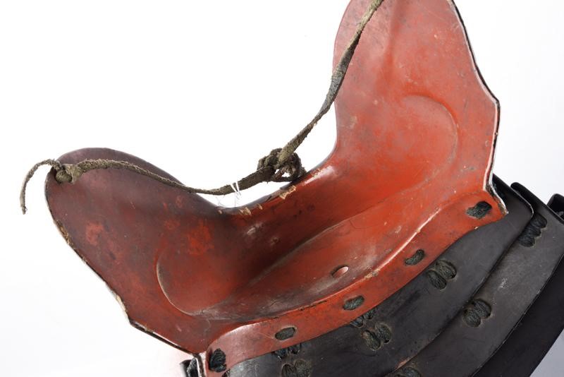 Of the tsubame school. With iron structure covered with black lacquer with a few small missing parts at the borders and on the chin, minor craquelure. Red-lacquered inside with no defects. Asenagashi no ana. Orikugi. Three-plate, iron yodare-kake with th