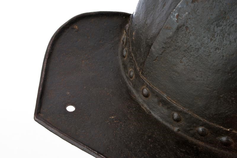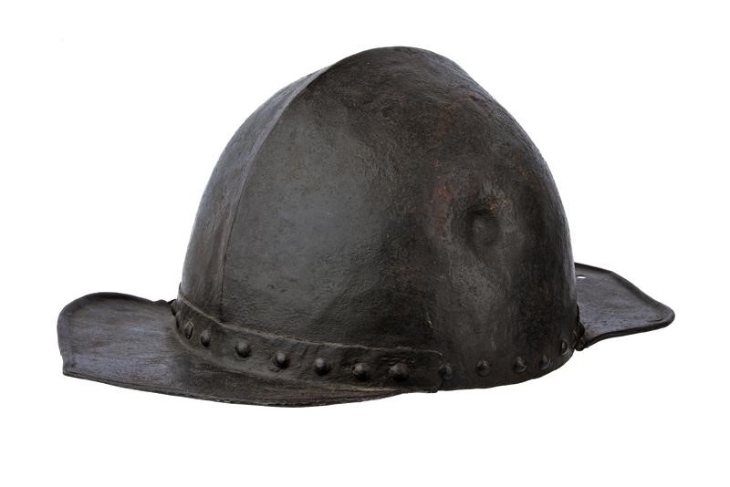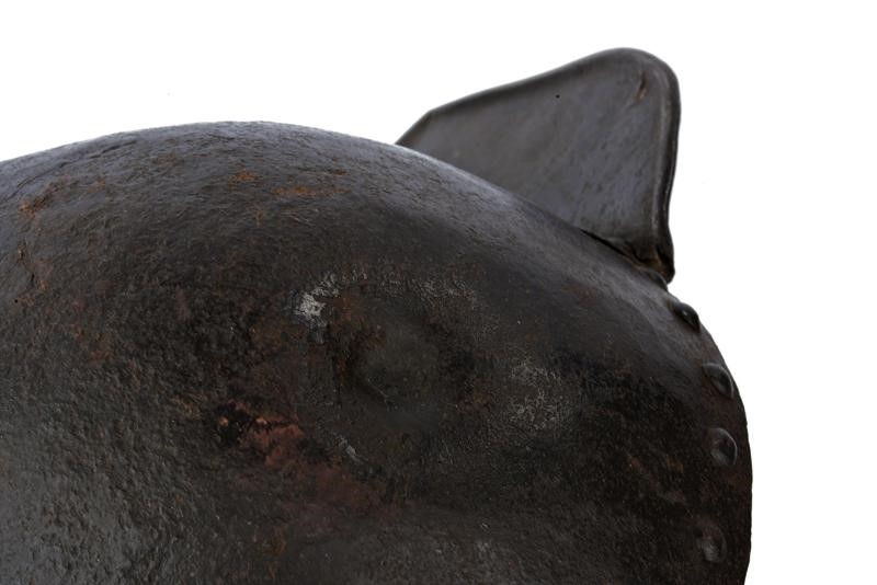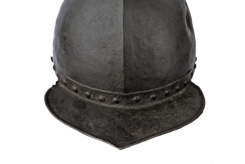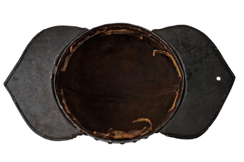 Heavy skull in one piece, ribbed at the centre, blow mark, flat visor and plate of the nape-guard are both flat, riveted, pointed and with hemmed border, movable cheek-pieces (missing), round rivets. Remains of leather straps. Rare.
