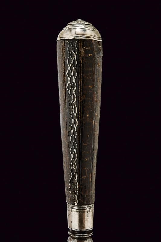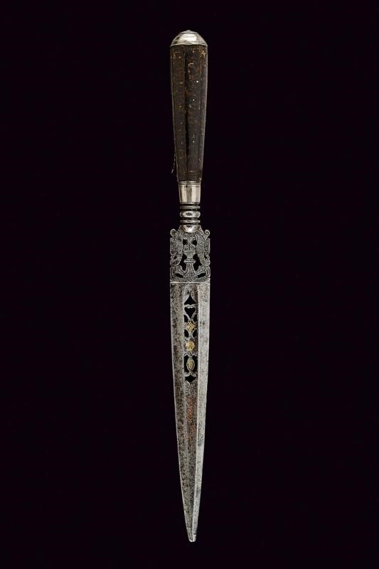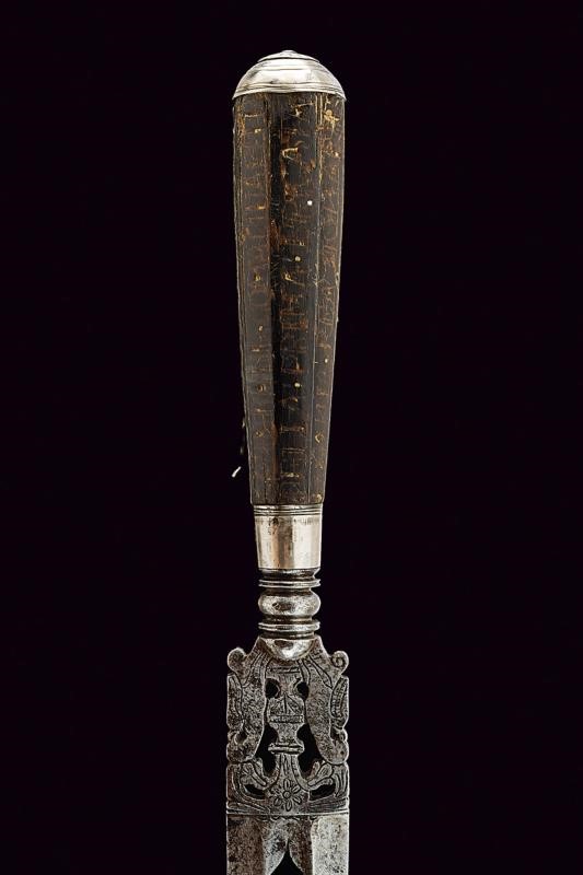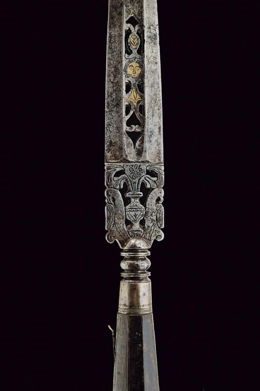 Solid, straight, double-edged blade, of hexagonal section (pitting and small lacking part at the tip). Faces with light fuller. The central band pierced at the forte and with a mask featuring remains of gilding; at the middle remains of inlays with raceme