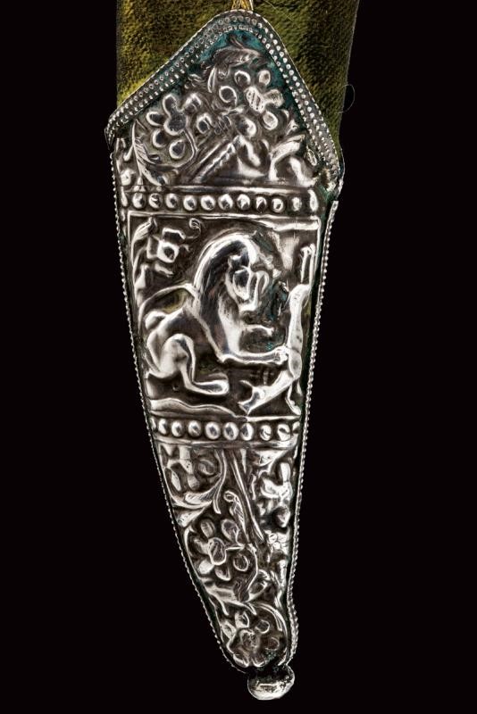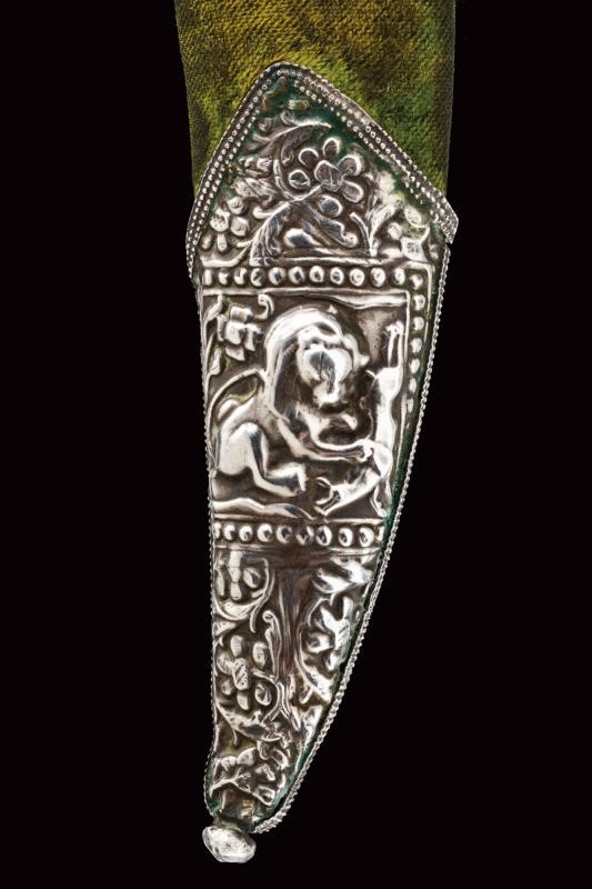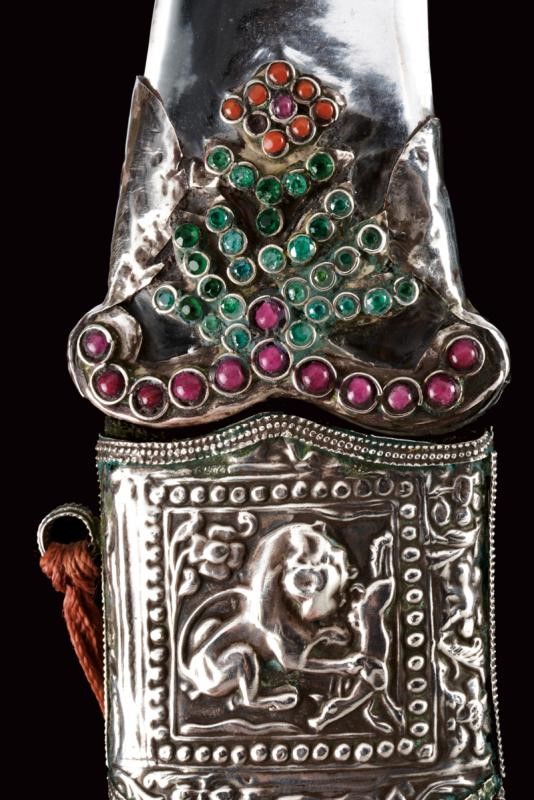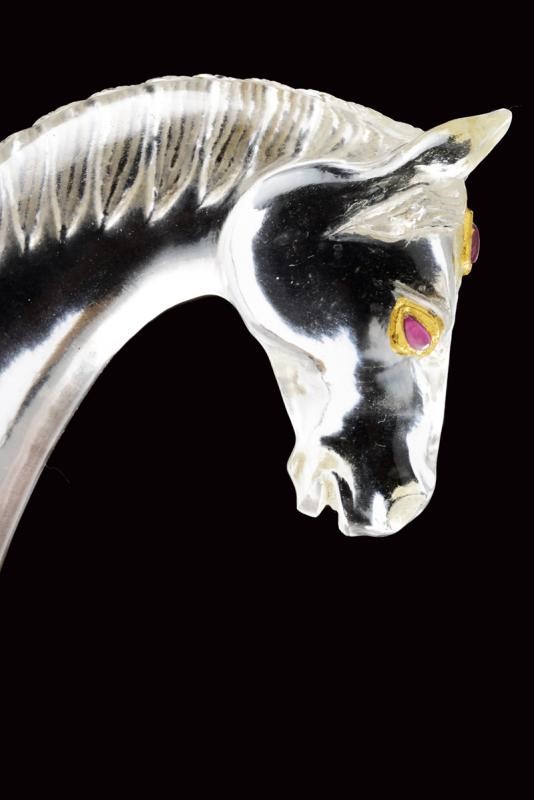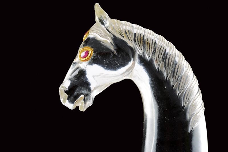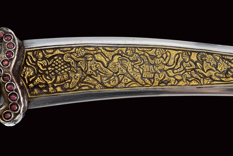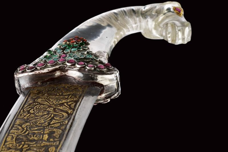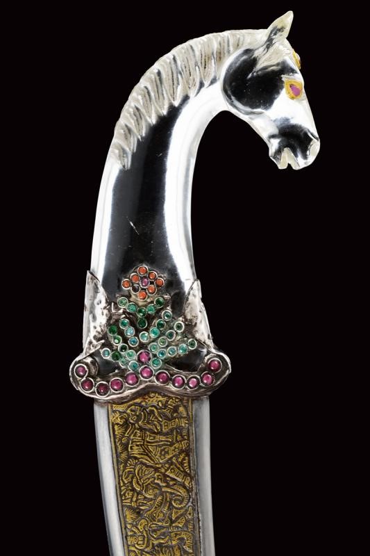 Decorative, curved, damask, double-edged blade, with slightly reinforced tip, decorated with gilded bas-relief engravings at the center depicting human figures, tigers, an elephant and other animals. Rock crystal hilt with pommel shaped as a horse's head,