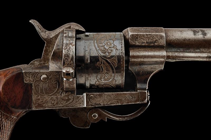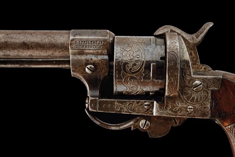 Rifled, cylindrical, 7 mm cal. barrel (visible rifling, bore needs cleaning). With mark of the Lefaucheux company and crowned "N" mark, "B" mark within a circle. Six-shot cylinder with part of the antique browning, engraved with floral and rocaille, with